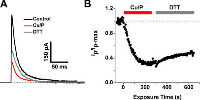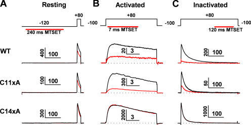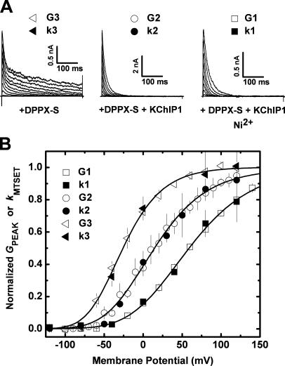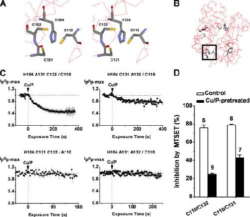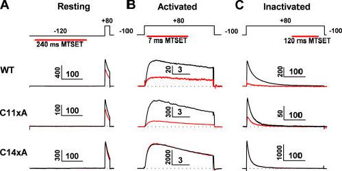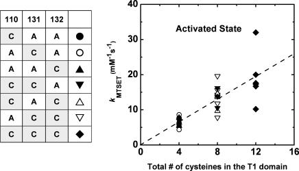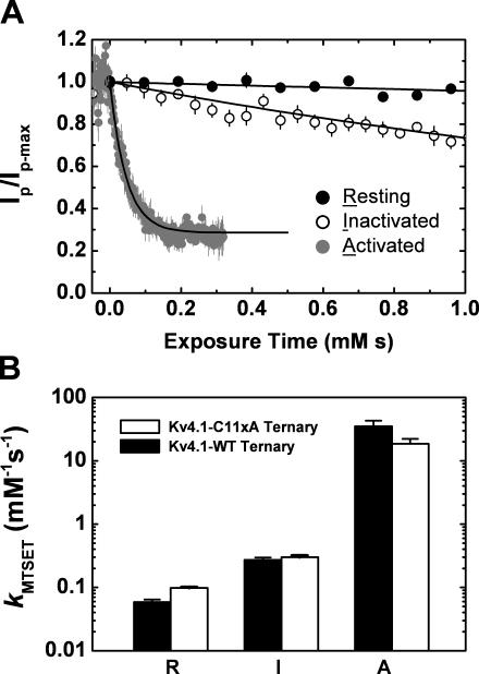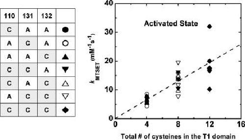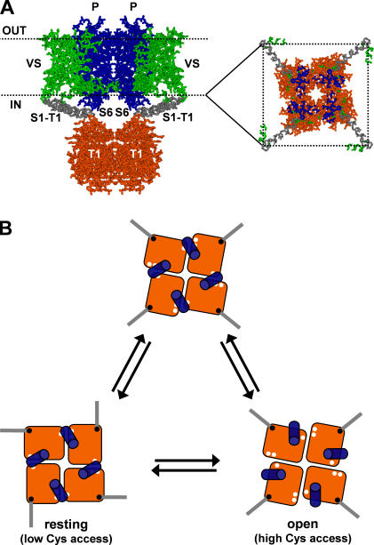 The intracellular tetramerization domain (T1) of most eukaryotic voltage-gated potassium channels (Kv channels) exists as a "hanging gondola" below the transmembrane regions that directly control activation gating via the electromechanical coupling between the S4 voltage sensor and the main S6 gate. However, much less is known about the putative contribution of the T1 domain to Kv channel gating. This possibility is mechanistically intriguing because the T1-S1 linker connects the T1 domain to the voltage-sensing domain. Previously, we demonstrated that thiol-specific reagents inhibit Kv4.1 channels by reacting in a state-dependent manner with native Zn(2+) site thiolate groups in the T1-T1 interface; therefore, we concluded that the T1-T1 interface is functionally active and not protected by Zn(2+) (Wang, G., M. Shahidullah, C.A. Rocha, C. Strang, P.J. Pfaffinger, and M. Covarrubias. 2005. J. Gen. Physiol. 126:55-69). Here, we co-expressed Kv4.1 channels and auxiliary subunits (KChIP-1 and DPPX-S) to investigate the state and voltage dependence of the accessibility of MTSET to the three interfacial cysteines in the T1 domain. The results showed that the average MTSET modification rate constant (k(MTSET)) is dramatically enhanced in the activated state relative to the resting and inactivated states (approximately 260- and approximately 47-fold, respectively). Crucially, under three separate conditions that produce distinct activation profiles, k(MTSET) is steeply voltage dependent in a manner that is precisely correlated with the peak conductance-voltage relations. These observations strongly suggest that Kv4 channel gating is tightly coupled to voltage-dependent accessibility changes of native T1 cysteines in the intersubunit Zn(2+) site. Furthermore, cross-linking of cysteine pairs across the T1-T1 interface induced substantial inhibition of the channel, which supports the functionally dynamic role of T1 in channel gating. Therefore, we conclude that the complex voltage-dependent gating rearrangements of eukaryotic Kv channels are not limited to the membrane-spanning core but must include the intracellular T1-T1 interface. Oxidative stress in excitable tissues may perturb this interface to modulate Kv4 channel function.