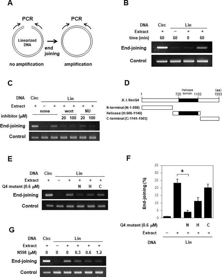 Fig. 1. N598 inhibited end-joining reaction in Xenopus egg extracts. (A) Schematic diagram of end-joining assay. (B) Circular plasmid DNA (Circ) or linearized plasmid DNA (Lin) was added to Xenopus egg extracts or buffer and incubated for 0 or 60 min. After incubation, DNA was purified and subjected to PCR analysis (End-joining). A part of β-lactamase gene on the plasmid was also amplified as the control (Control). (C) End-joining assay was performed after incubation of linearized DNA with the extracts for 60 min in the presence of DNA-dependent protein kinase (DNA-PK) inhibitors. wort; wortmannin, NU; NU-7441 (D) Schematic representation of Xenopus (X. l.) RecQ4 constructs. (E) End-joining assay was performed after incubation of linearized DNA with the extracts for 60 min in the presence of 0.6 μM of RecQ4 N-terminal region (N), helicase region (H), or C-terminal region (C). (F) Band intensities of three independent end-joining assays, as shown in (E) were measured using Image J, and the results were normalized to the value for the control. End-joining activities were calculated as percentage of activity relative to that for circular DNA and are shown as mean ± standard error. *P < 0.05 (G) End-joining assay was performed after the incubation of linearized DNA with the extracts for 60 min in the presence of N598 at the indicated concentration.