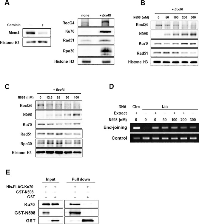 Fig. 2. The effect of N598 on double-strand break (DSB)-induced chromatin binding of DSB repair-related proteins. (A) (left panel) Sperm nuclei were incubated for 20 min with Xenopus egg extracts supplemented with geminin. After incubation, Mcm4 in the chromatin fraction was detected by western blotting. (right panel) Sperm nuclei were added to Xenopus egg extracts supplemented with geminin and incubated for 60 min in the presence or absence of EcoRI. After incubation, RecQ4, Ku70, Rad51, and Rpa30 in the chromatin fractions are detected by western blotting. (B, C) Sperm nuclei were added to the extracts supplemented with geminin, EcoRI, and indicated concentrations of N598. After 60 min incubation, RecQ4, N598, Ku70, and Rad51 in the chromatin fractions are detected by western blotting. (D) Results of an end-joining assay performed after incubation of linearized DNA with the extracts for 60 min in the presence of N598 at the indicated concentrations. (E) GST-N598, GST, and His-FLAG-Ku70 were mixed as indicated and incubated for 20 min, followed by GST-pull down assay. Ku70, GST-N598, and GST in the reaction mixture (Input) or the fraction bound to glutathione-sepharose (Pull down) are detected by western blotting. GST, glutathione S-transferase.