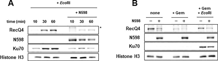 Fig. 3. The effect of N598 on the chromatin binding of RecQ4 and Ku70. (A) Sperm nuclei were added to the extracts supplemented with EcoRI and incubated for indicated periods in the presence or absence of N598 (100 nM). Then, endogenous RecQ4, N598, and Ku70 in the chromatin fractions are detected. A nonspecific band is indicated by an asterisk. (B) Sperm nuclei were incubated in the extracts supplemented with or without geminin (Gem) and EcoRI for 45 min in the presence or absence of N598 (100 nM). After the incubation, chromatin fractions were isolated and endogenous RecQ4 and N598 in the chromatin fractions are detected.