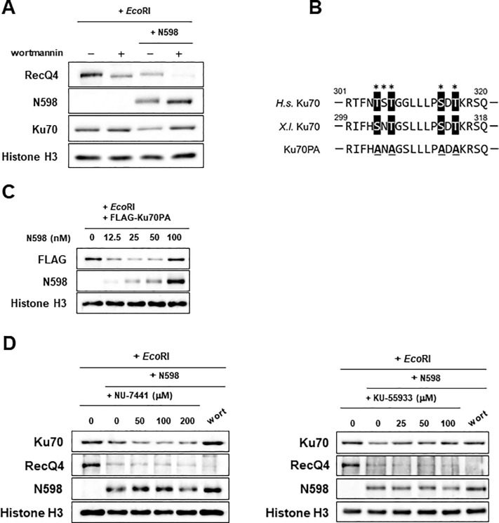 Fig. 4. N598 inhibited the chromatin binding of Ku70 in a manner dependent on ATM kinase activity. (A) Sperm nuclei were added to the extracts supplemented with geminin and EcoRI, and incubated with wortmannin (100 μM) and/or N598 (50 nM) for 60 min. After incubation, chromatin fractions were isolated and endogenous RecQ4, N598, and Ku70 in the chromatin fractions are detected. (B) Sequence alignment of the putative phosphorylation sites of human (H.s.) and Xenopus (X. l.) Ku70. Mutated residues in Ku70PA are indicated. Asterisks indicate reported phosphorylation sites in human Ku70 (see text). (C) Sperm nuclei were added to the extracts supplemented with geminin, EcoRI, and FLAG-tagged Ku70PA (25 nM), and incubated with the indicated concentration of N598 for 60 min. After incubation, chromatin fractions were isolated and chromatin-bound proteins are detected. (D) Sperm nuclei were incubated in extracts supplemented with EcoRI and the indicated concentration of NU-7441, KU-55933, or wortmannin (100 μM) in the presence or absence of N598 (50 nM) for 60 min. After incubation, chromatin fractions were isolated, and chromatin-bound proteins were detected.