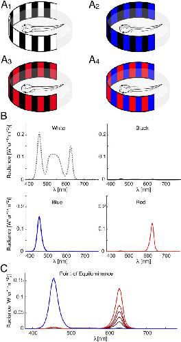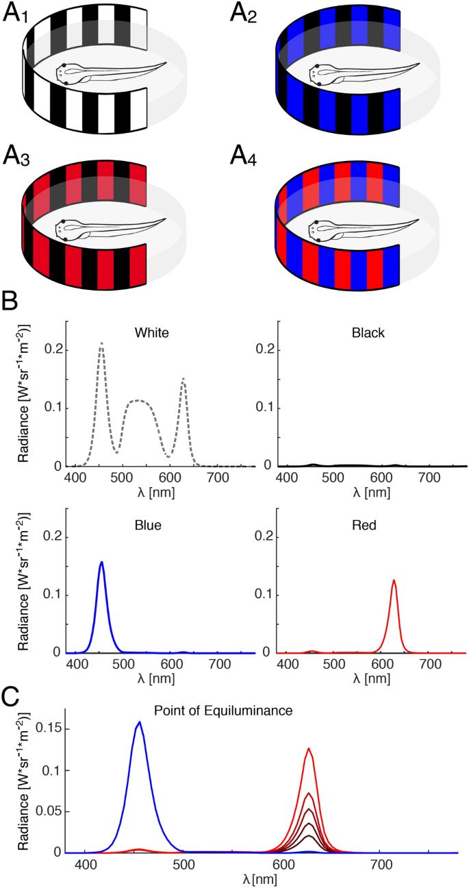 Figure 1. Color patterns and wavelength spectrum of large-field visual motion stimuli. (A) Schematics of color motion stimuli with blackâwhite (A1), blackâblue (A2), blackâred (A3) and redâblue (A4) vertical stripes that were projected onto a cylindrical screen around the centered semi-intact preparation of a Xenopus tadpole. (B) Spectra of white, black, blue and red light emitted by the projectors at maximal intensity. (C) Graph depicting the method to identify the point of equiluminance; note that the intensity of the blue stripes was held constant, whereas the intensity of the red stripes was gradually altered. Figure assembled with Affinity Designer (version 1.8.3).