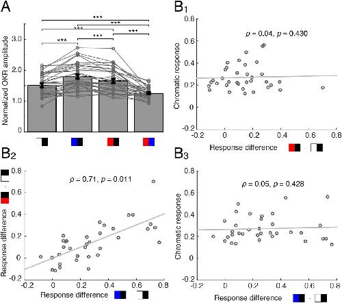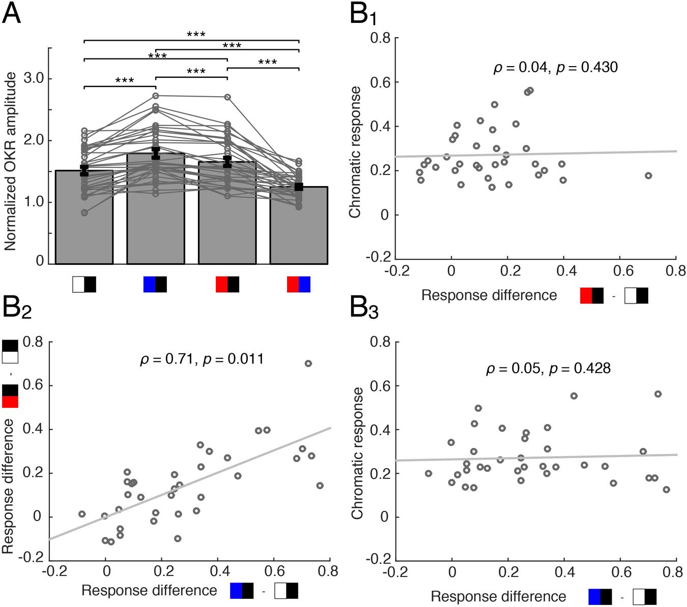 Figure 3. Color-dependent differential OKR performance of semi-intact preparations of Xenopus tadpoles. (A) Bar plot depicting the relative OKR amplitude for large-field visual motion stimuli with different color combinations; note the larger responses when black stripes were paired with blue or red compared to black–white stripes; ***, p < 0.0001 (n = 34; Mann–Whitney U-test). (B) Scatter plot depicting relative chromatic response (OKR amplitude at POE; see “Methods”) magnitudes (n = 34 animals) as function of the difference in amplitude between the conditions: red–black and white–black (B1) and blue–black and white–black (B3); (B2) illustrates the difference in response magnitudes between blue–black and white–black (x-axis) and red–black and white–black (y-axis); despite the mathematical coupling, there is a significant correlation between blue/white and red/white response magnitudes (expected correlation due to coupling: ρ = 0.48). Figure assembled with Affinity Designer (version 1.8.3).
