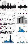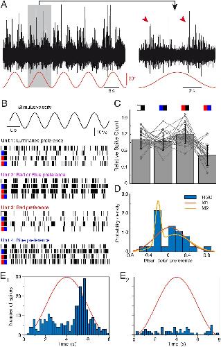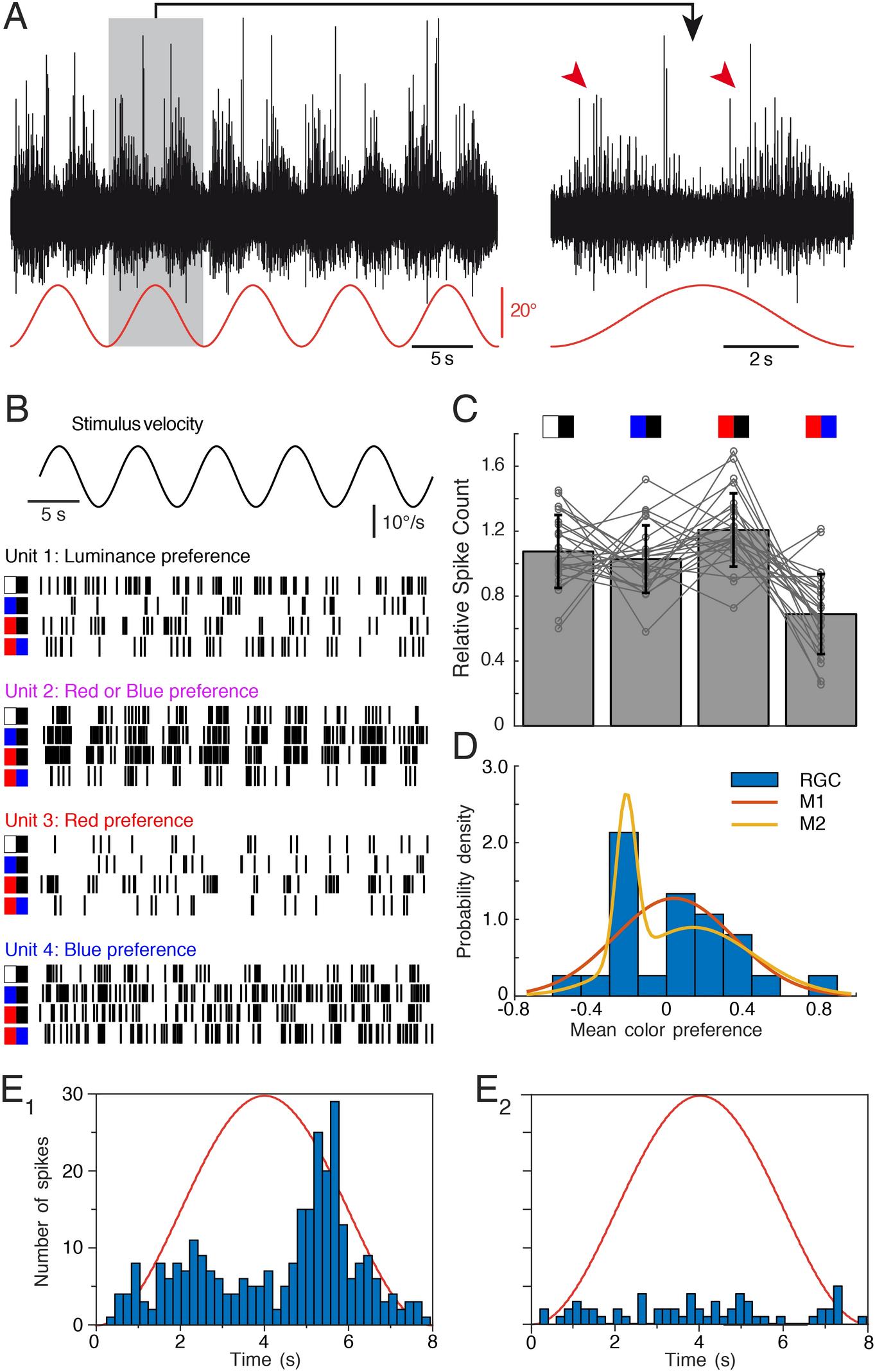 Figure 4. Retinal ganglion cell spike discharge during visual image motion stimulation with different color combinations in isolated optic nervesâeyes of Xenopus tadpoles. (A) Representative multi-unit spike discharge of the optic nerve in response to large-field visual motion stimulation with a blackâwhite striped vertical pattern (red trace); the trace on the right is a magnified view of a single motion cycle (grey area) of the trace on the left; note the bidirectional velocity sensitivity (red arrow heads). (B) Raster plot of spike trains of four isolated individual units with different radiance or color preferences; units respond preferentially to high radiance contrast (unit 1), to blue or red versus black (unit 2) or to red or blue stimulus combinations (units 3 and 4). (C) Bar plot depicting relative spike counts of all isolated units (nâ=â25) during visual motion stimulation with different color combinations (icons on top). (D) Histogram of color preferences of nâ=â25 individual retinal ganglion cell units (RGC, blue). Negative color preference indicates preferential responses to achromatic stimuli, positive values indicate larger responses to single-colored visual motion. Red and yellow curves depict distributions from Gaussian mixture models with one (red, M1) or two (yellow, M2) components fitted to the data. (E) Peri-stimulus time histogram of the average spike discharge (200 ms bin width) over a single image motion cycle at 0.125 Hz (8 s) of two single units (E1,E2) at the POE; note the residual directional response of the unit in (E1); red sinusoids represent stimulus cycles. Figure assembled with Affinity Designer (version 1.8.3).