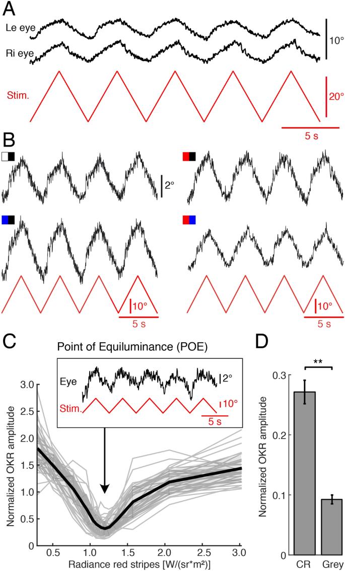 Figure 2. Color information contributes to large-field visual motion-induced eye movements of semi-intact preparations of Xenopus tadpoles. (A) Representative movements of the left (le) and right (ri) eye (position, black traces) evoked by alternating motion of a red-blue vertical striped pattern at constant velocity (±â10°/s; red trace). (B) Typical examples of eye movements in a given preparation (position, black traces) evoked by alternating motion of a blackâwhite, blackâblue, blackâred and redâblue vertical striped pattern (see color-code) at constant velocity (±â10°/s; red traces). (C) Individual (grey traces) and averaged (black trace; nâ=â34) normalized OKR amplitudes evoked by a red-blue vertical striped motion pattern as function of the radiance of the red stripes; the inset illustrates a typical example of residual eye movements at the POE. (D) Bar plot depicting the response amplitude evoked by chromatic stimuli (CR) at the POE, determined individually for each animal, and control baseline amplitude (Grey). **, pâ<â0.01 (paired t-test). Figure assembled with Affinity Designer (version 1.8.3).