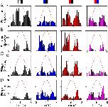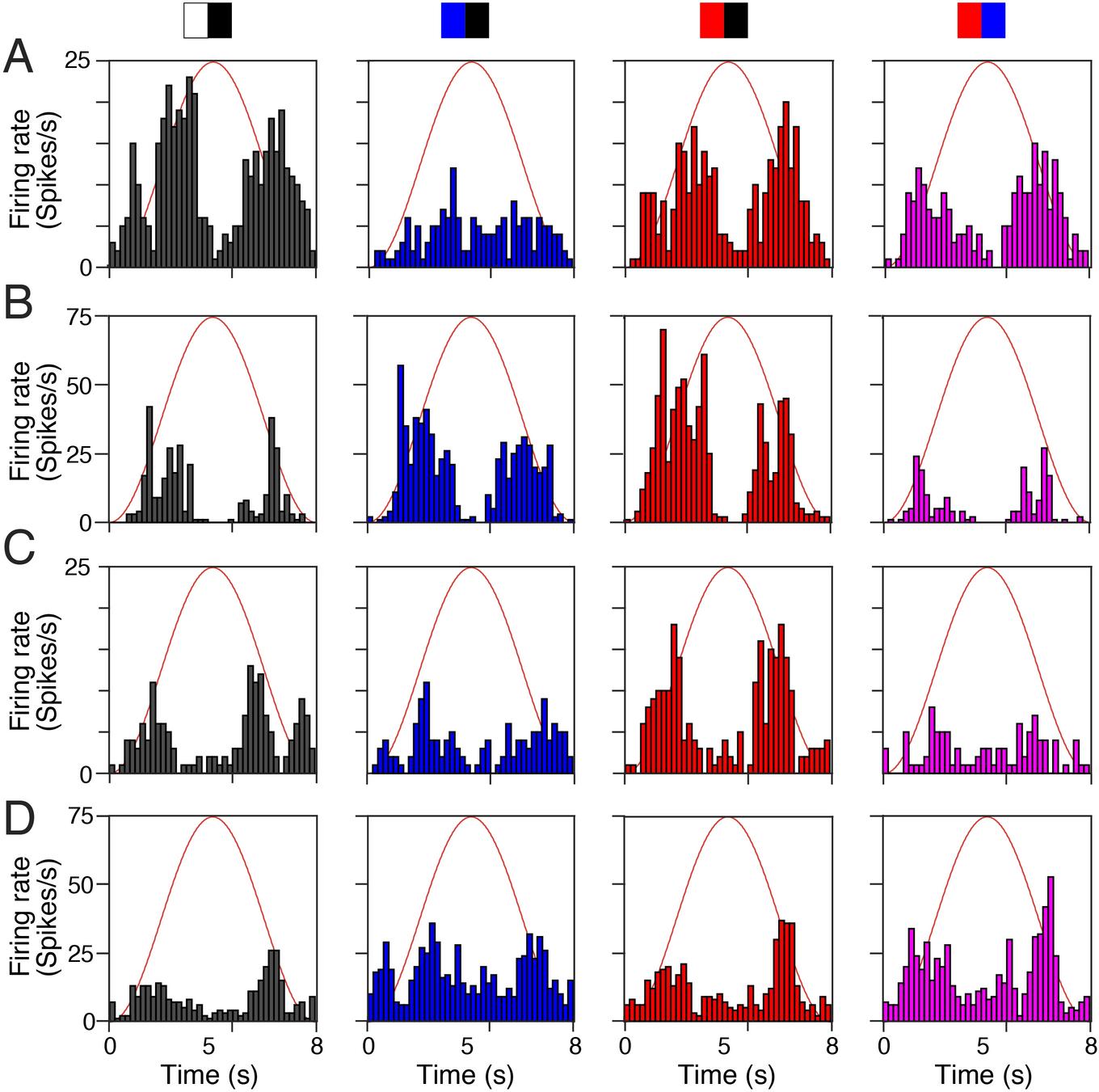 Figure 5. Peri-stimulus time histogram of retinal ganglion cell activity in isolated optic nervesâeyes of Xenopus tadpoles. (AâD) Peri-stimulus time histogram of the average spike discharge (200 ms bin width) over a single image motion cycle at 0.125 Hz (8 s) of the four units with different radiance or color preferences depicted in Fig. 4B as units 1â4; units respond preferentially to high radiance contrast (A), to blue or red versus black (B) or to red or blue stimulus combinations (C,D); black/white and color stripe combinations are indicated by the icons above the top row; red sinusoids represent stimulus cycles. Figure assembled with Affinity Designer (version 1.8.3).