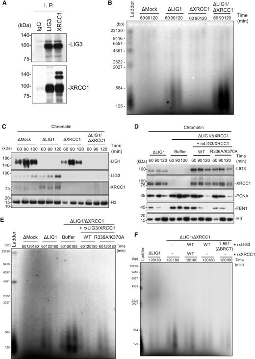 Figure 2. LIG3-XRCC1 ensures Okazaki fragment ligation in the absence of LIG1. (A) Immunoprecipitation (I. P.) of xLIG3 and xXRCC1 from egg extracts. I. P. was performed with anti-xLIG3 or -xXRCC1 antiserum. Pre-immune serum was also used as a control. Immunoprecipitates were analyzed by immunoblotting using the indicated antibodies (n = 2). (B) Mock-, xLIG1-, xXRCC1- or xLIG1/xXRCC1-depleted extracts were used to replicate sperm chromatin. Genomic DNA was purified and analyzed as in Figure 1G (n = 3). (C) Chromatin-bound proteins from (B) were monitored by immunoblotting using the indicated antibodies (n = 3). (D) xLIG1- and xLIG1/xXRCC1-depleted extracts were used to replicate sperm chromatin. xLIG1/xXRCC1-depleted extracts were supplemented with either buffer (+Buffer), wild-type 3Ã Flag-xLIG3-xXRCC1-myc, or 3Ã Flag-xLIG3-xXRCC1-R336AK370A-myc lacking the poly-ADP-ribose binding activity of xXRCC1 (n = 3). (E) Replication products from (D) were analyzed as in Figure 1G (n = 2). (F) xLIG1- and xLIG1/xXRCC1-depleted extracts were used to replicate sperm chromatin. xLIG1/xXRCC1-depleted extracts were supplemented with either buffer (+Buffer), wild-type 3Ã Flag-xLIG3-xXRCC1-myc, 3Ã Flag-xLIG3 or 3Ã Flag-xLIG3 lacking the BRCT domain. Replication products were analyzed as in Figure 1G (n = 2). |