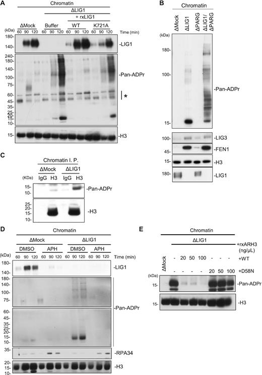 Figure 3. LIG1 deficiency causes histone H3 ADP-ribosylation. (A) Mock- and xLIG1-depleted extracts were used for replication of sperm chromatin. xLIG1-depleted extracts were supplemented with wild-type xLIG1 or xLIG1-K721A. Chromatin-bound proteins were analyzed by immunoblotting using the indicated antibodies and pan ADP-ribose (Pan-ADPr) detecting reagent (n = 3). The asterisk indicates a non-specific band. (B) Mock-, xLIG1-, xPARG- and xLIG1/xPARG-depleted extracts were used for replication of sperm nuclei. Chromatin-bound proteins were analyzed as in Figure 3A (n = 2). (C) Chromatin fractions from the indicated immunodepleted extracts were solubilized with MNase followed by immunoprecipitation with anti-histone H3 antibodies after treatment with 1% SDS. The resultant immunoprecipitates were analyzed as in Figure 3A (n = 2). (D) Mock- and xLIG1-depleted extracts were used for replication of sperm nuclei in the presence of 30 μM APH where indicated. Chromatin-bound proteins were analyzed by immunoblotting using the indicated antibodies and pan ADP-ribose detecting reagent (n = 2). (E) Mock- and xLIG1-depleted extracts were used for replication of sperm chromatin. xLIG1-depleted extracts were supplemented with either buffer or recombinant wild-type His10-xARH3 or His10-xARH3-D58N, (0.2â1 μM). Chromatin-bound proteins were analyzed by immunoblotting using the indicated antibodies and pan ADP-ribose detecting reagent (n = 2). |