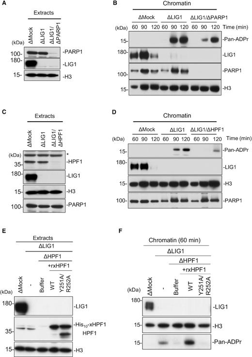 Figure 4. PARP1-HPF1 stimulates histone H3 ADP-ribosylation in LIG1-depleted extracts. (A) Mock-, xLIG1- and xLIG1/xPARP1-depleted extracts were analyzed by immunoblotting using the indicated antibodies. (B) The extracts from (A) were used to replicate sperm nuclei. Chromatin-bound proteins were analyzed by immunoblotting (n = 2). (C) Mock-, xLIG1- and xLIG1/xHPF1-depleted extracts were analyzed by immunoblotting using the indicated antibodies. The asterisk indicates a non-specific band. (D) The extracts from (C) were used to replicate sperm nuclei. Chromatin-bound proteins were analyzed (n = 2). (E) xLIG1/xHPF1-depleted extracts were supplemented with buffer, recombinant His10-xHPF1 (WT), or recombinant mutant His10-xHPF1 (Y251A/R252A) defective for PARP1 binding activity. (F) The extracts from (E) were used to replicate sperm nuclei. Chromatin-bound proteins were analyzed (n = 2). |