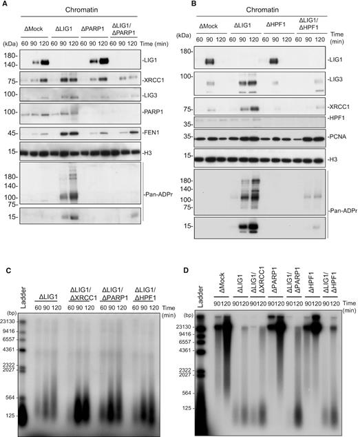 Figure 5. HPF1-dependent PARP activation promotes alternative Okazaki fragment ligation. (A) Mock-, xLIG1-, xPARP1- and xLIG1/xPARP1-depleted extracts were used for replication of sperm nuclei. Chromatin-bound proteins were analyzed by immunoblotting using indicated antibodies (n = 2). (B) Mock-, xLIG1-, xHPF1- and xLIG1/xHPF1-depleted extracts were used for replication of sperm nuclei. Chromatin-bound proteins were analyzed by immunoblotting using the indicated antibodies (n = 2). (C) xLIG1-, xLIG1/xXRCC1-, xLIG1/xPARP1- or xLIG1/xHPF1-depleted extracts were used to replicate sperm chromatin. Genomic DNA was purified and labeled using exonuclease-deficient Klenow fragments and α-32P dCTP. Samples were separated in a denaturing agarose gel, and the incorporation of radioactivity was monitored by autoradiography (n = 3). (D) Replication products in mock-, xLIG1-, xLIG1/xXRCC1-, xPARP1-, xLIG1/xPARP1-, xHPF1- or xLIG1/xHPF1-depleted extracts were separated by alkaline agarose gel electrophoresis followed by autoradiography (n = 4). |