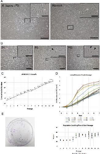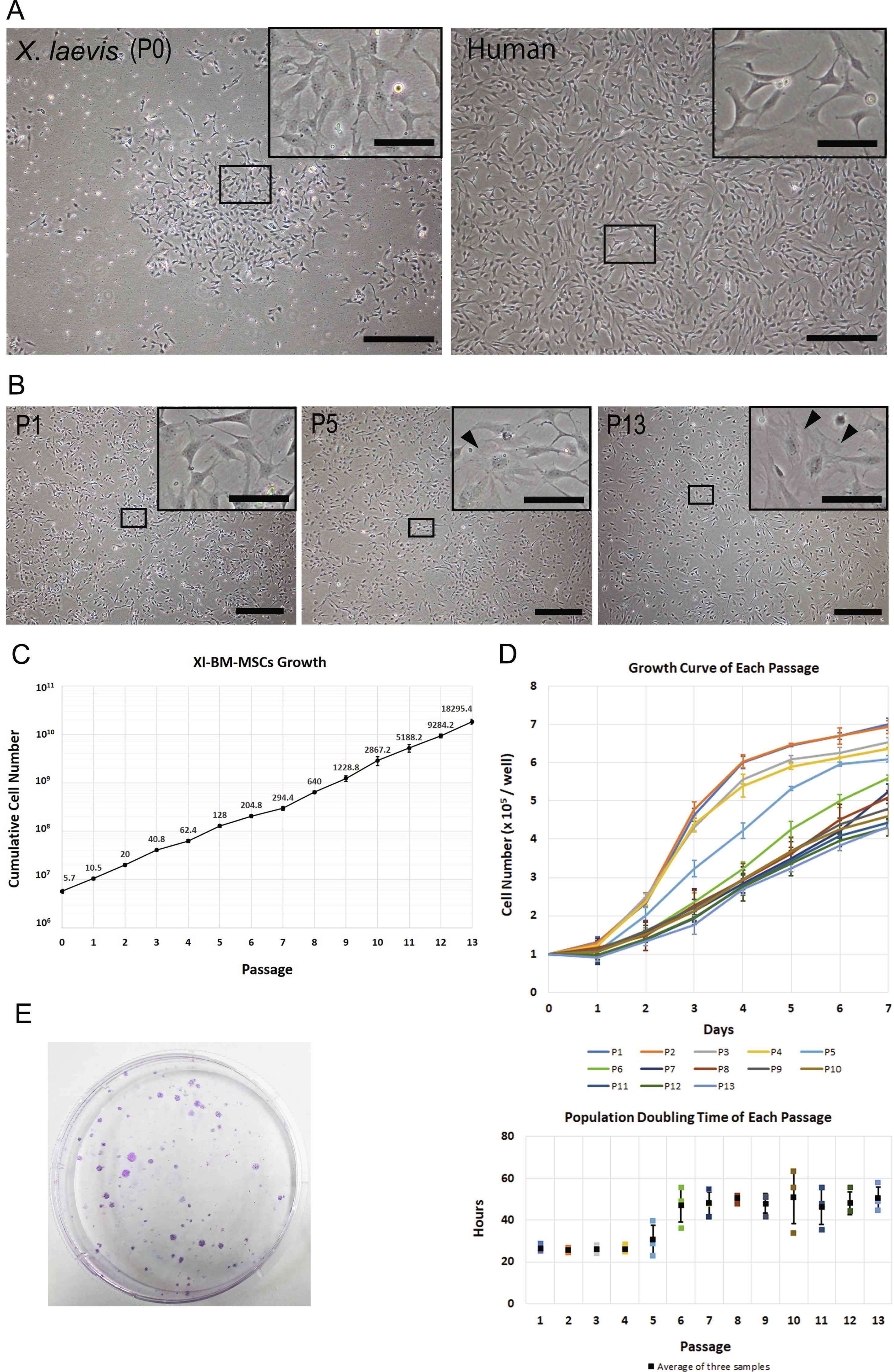 Fig. 2. Characteristics of Xl-BM-MSCs. (A) Comparison of the cell morphology between Xl-BM-MSCs and human BM-MSCs (scale bar = 500 μm). The black box is a magnified view (scale bar = 100 μm). (B) Comparison of the cell morphology among passaged Xl BM-MSCs. Black arrowheads indicated cells with flat shape and spread cytoplasm (scale bar = 500 μm). The black box is a magnified view (scale bar = 100 μm). (C) Growth curve of Xl-BM-MSCs. Cells growth was observed until P13. Data show the mean of triplicate independent samples and the error bars represent the SD. (D) Growth curve and PDT of each passage. Cells were reseeded in 6-well culture plates at a density of 1 à 105 cells/well to observe cell growth and PDT at each passage. PDT in the log phase (cells increased exponentially) was calculated by the formula: PDT = T à ln(2)/ln(Xe/Xb). T: log phase time (from day 1 to day 3). Xb: cell number at the beginning of log phase. Xe: cell number at the end of log phase. Data show the mean of triplicate independent samples and error bars represent the SD. (E) CFU assay of Xl-BM-MSCs. 2 à 105 fresh Xl-BM-derived mononuclear cells seeded in a 10-cm plastic dish. After 12 days, the cells were fixed and stained with Giemsa stain solution.