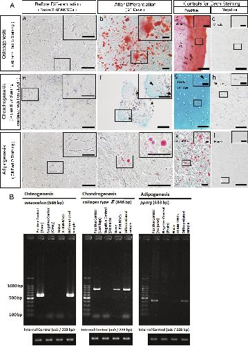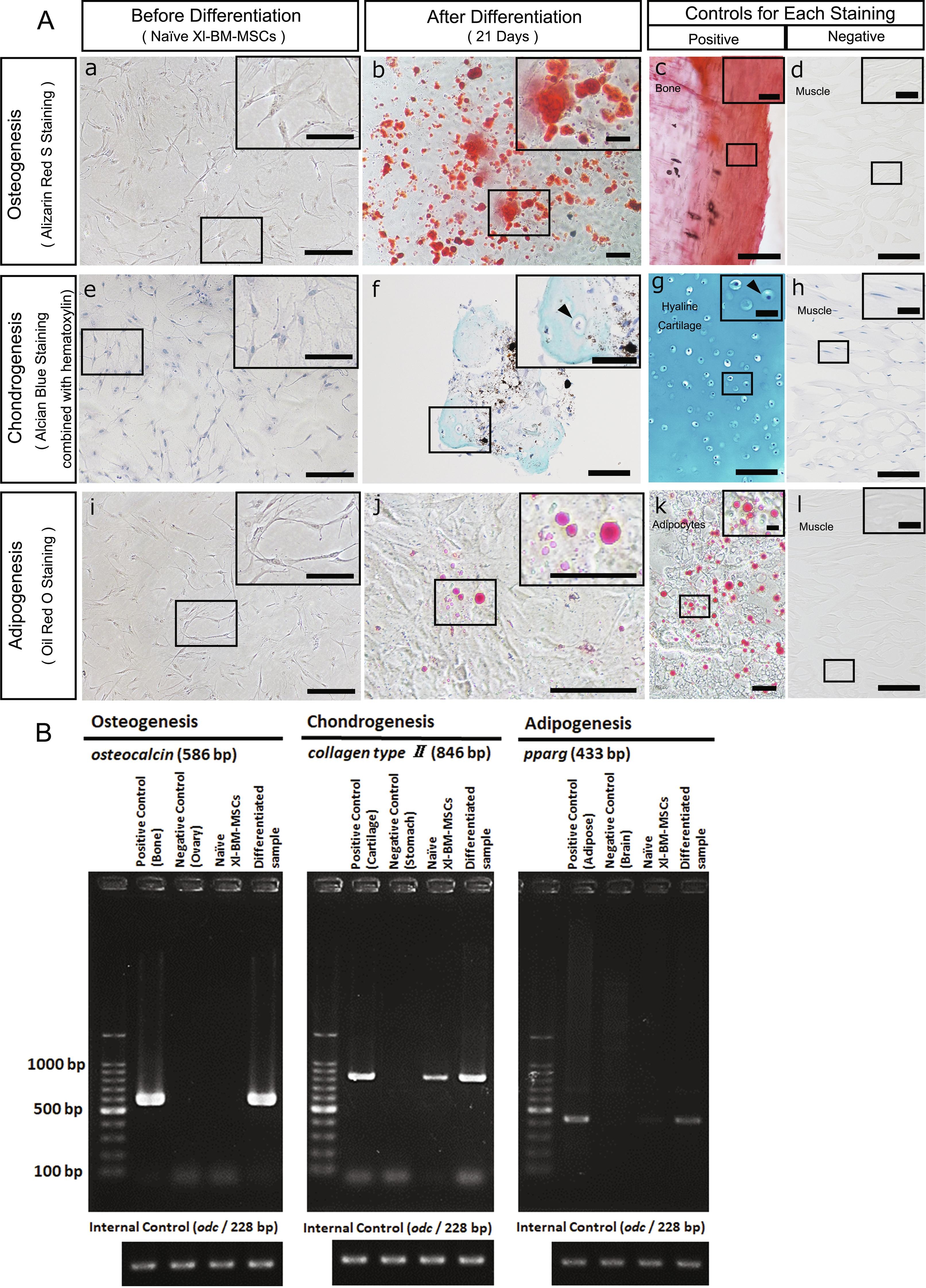 Fig. 4. Differentiation capacity of Xl-BM-MSCs. (A) Each sample was stained with Alizarin Red S (red color) (a-d), Alcian Blue (blue color) combined with hematoxylin (bluish purple color) (e-h), and Oil Red O (red color) (i-l). (a, e, i) Naïve Xl-BM-MSCs before induction. Scale bar = 200 μm. The black box is a magnified view (scale bar = 100 μm). (b, f, j) Samples after differentiation (scale bar = 100 μm). The black box is a magnified view (scale bar = 50 μm). Black arrowhead indicates chondrocyte. (c, g, k) Positive controls for each staining. Scale bar = 100 μm. The black box is a magnified view (scale bar = 25 μm). Black arrowhead indicates chondrocytes. (d, h, l) Negative controls for each staining. Scale bar = 100 μm. The black box is a magnified view (scale bar = 25 μm). (B) RT-PCR of differentiation marker expression. osteocalcin, collagen type ⠡, and pparg were used as osteocyte, chondrocyte, and adipocyte markers, respectively. odc was used as an internal control.