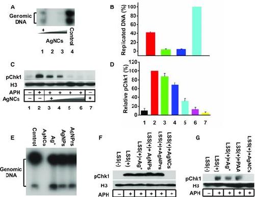 Figure 2. AgNCs uniquely inhibit DNA replication and replication checkpoint. (A, B) DNA replication in extracts is sensitive to AgNCs. (A) Xenopus egg extracts were incubated with sperm nuclei in the presence of increasing concentrations of AgNCs. DNA replication was monitored by agarose gel electrophoresis after incorporation of α-[32P]dCTP into genomic DNA. (B) Quantification of three independent experiments normalized to untreated controls. (C, D) AgNCs inhibit the DNA replication checkpoint. (C) Xenopus egg extracts were treated with aphidicolin with or without AgNCs at different concentrations and incubated with sperm nuclei. ATR activation was monitored by pChk1 western blotting. (D) Quantification of three independent experiments normalized to aphidicolin alone control. Impact of different silver nanomaterials on DNA replication and replication checkpoint. (E) Replicating extracts were incubated with silver ions (Ag+), silver nanoparticles (AgNPs), silver nanoprisms (AgNPrs) and silver nanoclusters (AgNCs) and DNA replication was assessed by incorporation of α-[32P]dCTP into genomic DNA. (F, G) The impact of Ag+, AgNPs, AgNPrs AgNCs and PAA on DNA replication checkpoint was monitored by pChk1 Western blotting. |