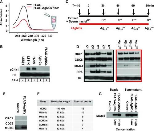 Figure 4. AgNCs interact with MCM protein complex. (A) Synthesis of FLAG-AgNCs (FLAG peptide: CGGMDYKDHDADYKDHDIDYKDDDDK). The decrease of FLAG peptide absorbance in the filter indicated the successful linkage of FLAG peptide on AgNCs. (B) FLAG-tagged AgNCs inhibits the DNA replication checkpoint. Xenopus egg extracts were treated with aphidicolin with or without AgNCs or FLAG-AgNCs and incubated with sperm nuclei. ATR activation was monitored by pChk1 western blotting. (C, D) Chromatin binding assay in the presence of FLAG-AgNCs. (C) Schematic representation of the experiments. (D) Chromatin was isolated through 30% sucrose cushion and bound proteins (ORC1, CDC6, MCM3, RPA and histone H3) resolved by 3%-8% gradient Tris-Acetate gels followed by western blot. Left: control, untreated extarcts. Right: extracts incubated with FLAG-tagged AgNCs. (E) Xenopus egg extracts were incubated with FLAG peptide (control) or FLAG-AgNCs, immunoprecipitated with anti-FLAG antibodies, whashed and processed for western blot with ORC1, CDC6 and MCM3 antibodies. (F) Xenopus egg extracts were incubated for 1 h with FLAG-AgNCs. Following FLAG immunoprecipitation, AgNCs-bound proteins were identified by mass spectrometry. MCM polypeptides recovered are indicated. (G) Purified hexameric MCM complex expressed in baculovirus-infected cells was incubated with FLAG-AgNCs in vitro. Bound and soluble fractions were processed for Western blotting with MCM3 antibodies. |
