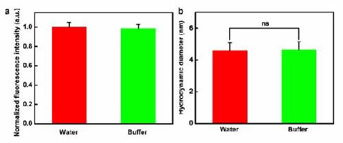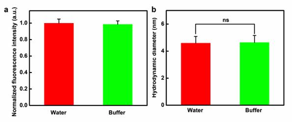 Figure S2. (a) Normalized fluorescence intensity of AgNCs after 6 hours incubation in water or in replication assay buffer. (b) Hydrodynamic diameter of AgNCs in water and in replication assay buffer. |