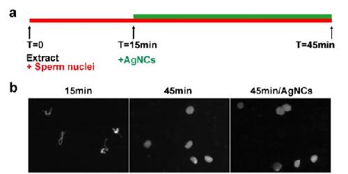 Figure S5. AgNCs does not inhibit nuclear assembly. (a) Schematic representation of the experiments. (b) Nuclear assembly in Xenopus egg extracts in the presence of AgNCs. Nuclear formation was followed over the course of 45 min by fluorescence microscopy with DAPI. |
