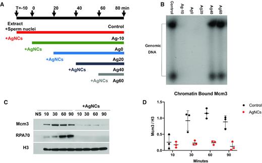 Figure 3. AgNCs affect DNA replication initiation. (A, B) Time-course of DNA replication assay. (A) Experiment time-course showing the time of AgNCs addition to DNA replication assay. (B) AgNCs were added to extracts at different time points during DNA replication (T = â10, 0, 20, 40, 60 min) and DNA replication products were monitored by agarose gel electrophoresis at 80 min after addition of AgNCs. For the first lane (control), no AgNCs were added and replication was monitored at 80 min. (C, D) AgNCs block pre-RC assembly. (C) Chromatin binding assays were performed in Xenopus egg extracts supplemented with demembranated sperm nuclei (2500 sperm/μl) and incubated for 10 min at 21°C for chromatin assembly following addition of AgNCs at indicated timepoints (10, 30, 60 and 90 min). Chromatin was isolated through 30% sucrose cushions and bound proteins were resolved by SDS-PAGE on 10% Bis-Tris gels and probed with specific antibodies against MCM3, RPA and histone H3. (D) The mean and standard deviation is shown for three ieendependent biological replicates. |