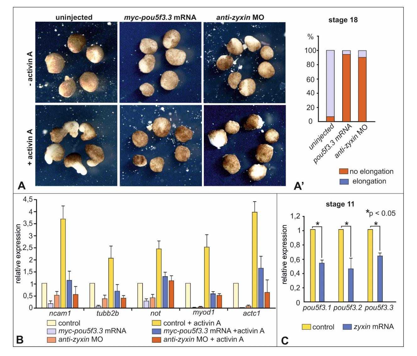 A’ Calculation of percentage of elongated animal caps after injection of anti-zyxin MO or mycpou5f3.3 mRNA in three independent experiments.