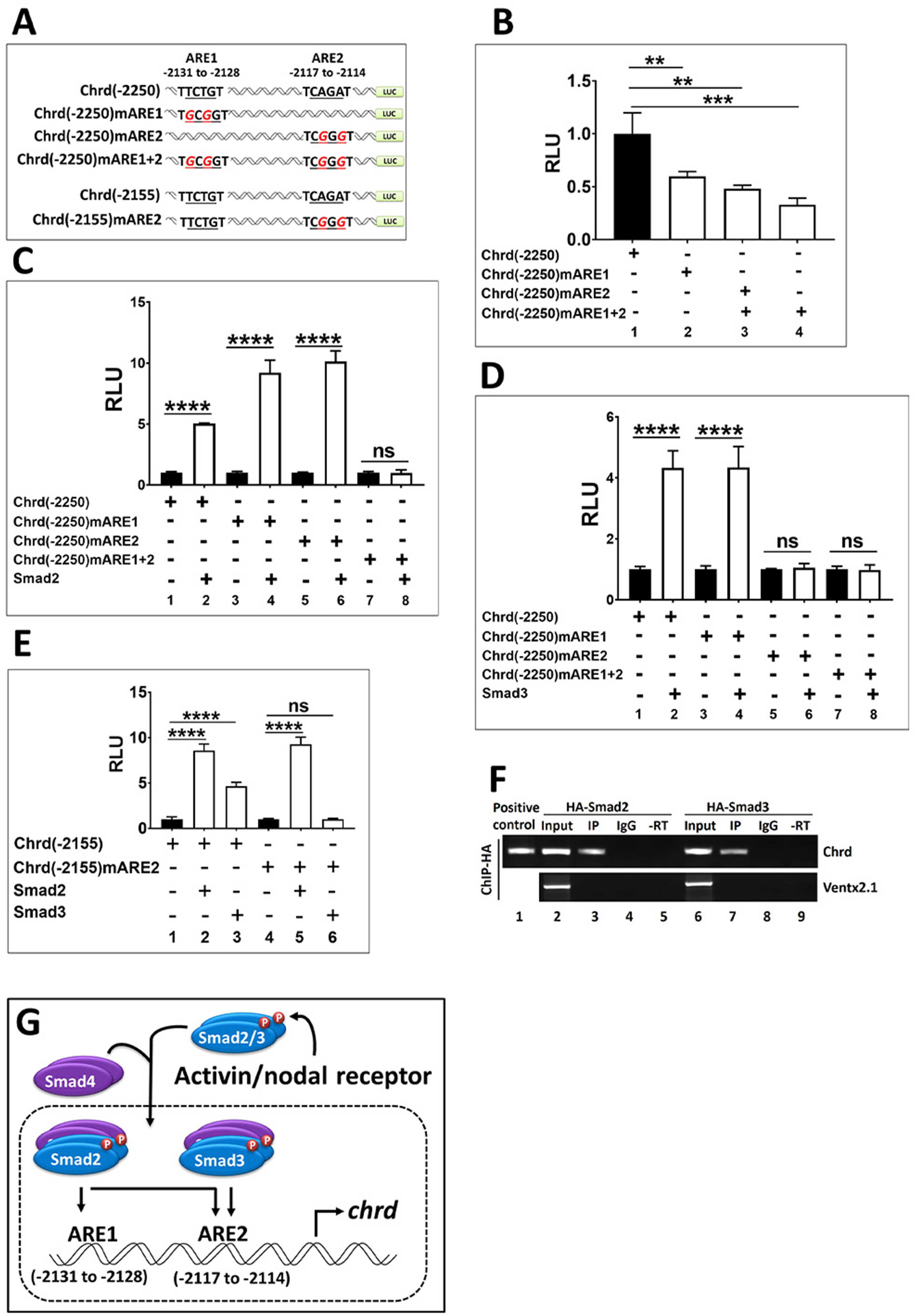 Fig. 4. Chrd promoter contains ARE1 and ARE2. (A) Systemic representation of mutated ARE1 and ARE2 (underlined, italic, red color) within the region of â2250 bps to â2155 bps selected in chrd promoter construct. (B) Relative luciferase activity for chrd(-2250) chrd(-2250)mARE1, chrd(-2250)mARE2, and doubly-mutated chrd(-2250)mARE1+2. (C and D) Relative luciferase activity assay for chrd(-2250) chrd(-2250)mARE1, chrd(-2250)mARE2, and doubly-mutated chrd(-2250)mARE1+2 with or without Smad2 or Smad3. (E) Relative reporter activity of chrd(-2155) and chrd(-2155)mARE2 with or without Smad2 or Smad3. (F) ChIP-PCR was performed with anti-HA immunoprecipitated endogenous chrd promoter using specific primers (PCR amplicon contained both ARE1 and ARE2 region). For positive control, chrd(-2250) plasmid was used as template and Ventx2.1 coding region primer serves as negative control. (G) Proposed model for Smad2/3 mediated regulation of chrd transcription. (For interpretation of the references to color in this figure legend, the reader is referred to the Web version of this article.)