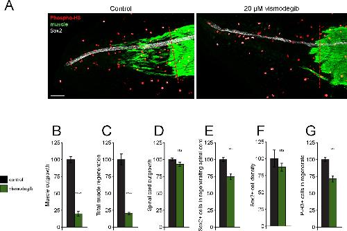 Figure 1—figure supplement 2. Treatment with Smoothened (Smo) antagonist vismodegib reduces muscle and spinal cord regeneration.Stage 39–40 X. laevis larvae were incubated with vehicle (0.1% DMSO, Control) or 20 µM vismodegib for 72 hr, then immunostained. (A) Representative z-projections of whole-mount immunostained samples for both groups at 72 h post amputation (hpa). Transverse red dashed line indicates amputation plane. Scale bar 100 µm. (B–G) Graphs show mean ± SEM regenerated muscle outgrowth (B) and total new muscle volume (C), regenerated spinal cord outgrowth (D), total number (E) and per length density (F) of Sox2+ cells in the regenerated spinal cord, and number of phospho-histone H3+ (P-H3+) cells (G) in the regenerate at 72 hpa as % of cohort-matched control. N of larvae: 8–10 samples per group. ***p<0.001, ****p<0.0001, ns: not significant, two-tailed t-test. |