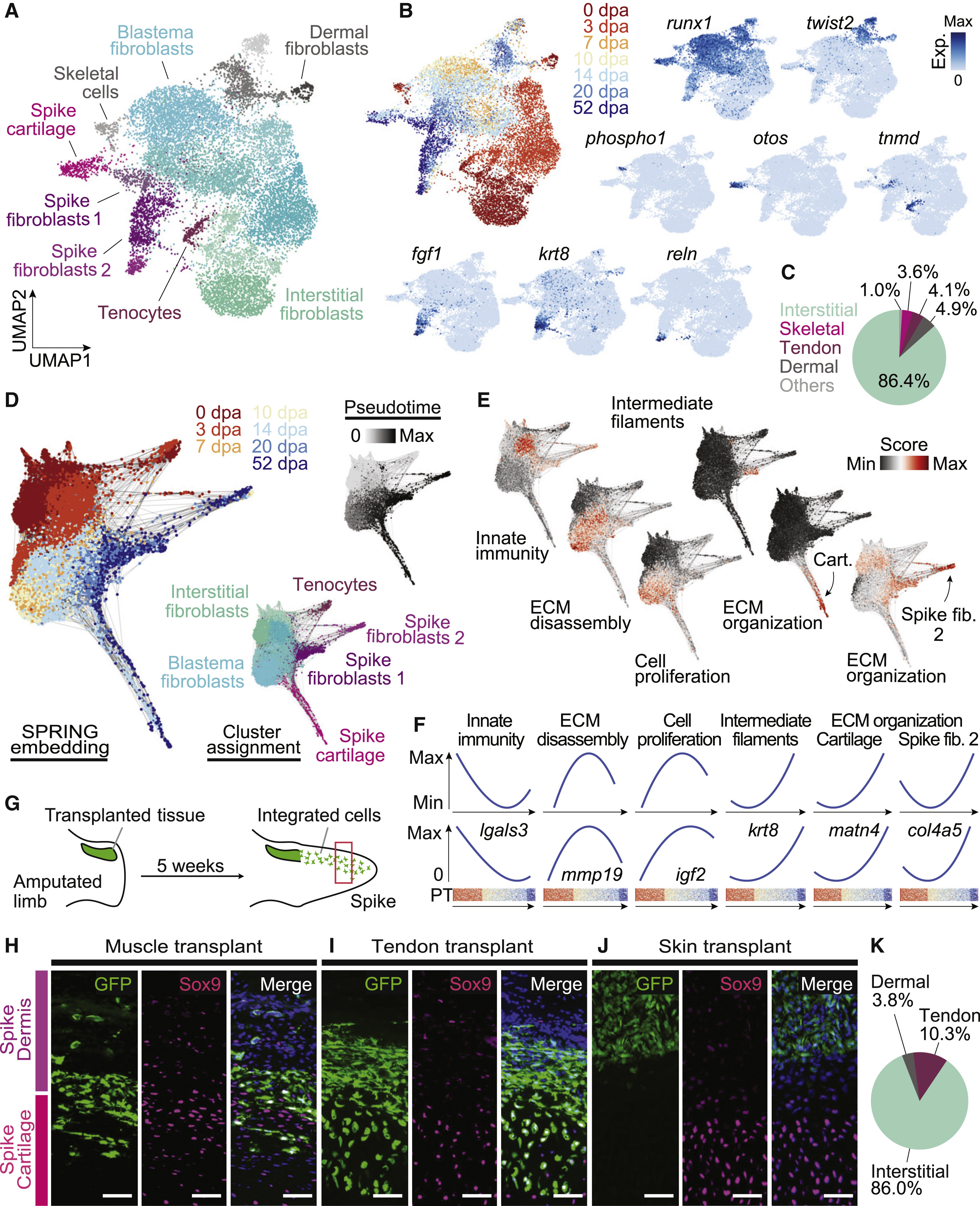 Figure 2. Dermis- and interstitium-derived blastema cells contribute differentially to spike cartilage (A) UMAP embedding of scRNA-seq data of 15,014 cells from a frog blastema time course after data integration using Harmony (Korsunsky et al., 2019). Cells are colored by cluster and cell type annotations are noted. CT cells shown here were extracted from the blastema cell atlases shown in Figures S1A and 1N, or were experimentally enriched by FACS (0 and 3-dpa cells). (B) Left: UMAP embedding as shown in (A) with cells being colored by sampling time point. Right and Bottom: feature plots visualizing the expression of cluster marker genes. (C) Pie chart showing fractions of cell types composing the CT in the mature uninjured state (0 dpa). (D) Spring plot (Weinreb et al., 2018) of Harmony-integrated scRNA-seq data of 13,124 CT cells excluding skeletal and dermal cells. Left: cells colored by time point. Center: cells are colored by cluster with cell types being noted. Right: cells colored by ranked pseudotime estimates obtained from a diffusion map analysis (Angerer et al., 2016). (E) GO enrichment scores identified based on genes differentially expressed along the pseudotime course. Scores are visualized as feature on the SPRING embedding. Innate immune response (GO:0045087), extracellular matrix (ECM) disassembly (GO:0022617), Positive regulation of cell proliferation (GO:0008284), Intermediate filament (GO:0005882), ECM organization (GO:0030198). (F) Top: GO enrichment scores are visualized as a function of pseudotime by a loess fitted curve through the data points. Bottom: expression intensities of example genes for each GO term are shown. (G) Schematic illustration of tissue transplantation assays. See Figure S2 for details. Red box indicates the regions shown in (HâJ). (HâJ) Magnified insets from representative longitudinal sections of muscle (H) (n = 2), tendon (I) (n = 2), and skin (J) (n = 2) transplantation samples. Sections were immunostained for GFP (donor tissue, green), Sox9 (chondrocytes, magenta), and the merged image with DAPI (nuclei, blue). The field of view was further divided into spike dermis (upper region, purple) and spike cartilage (lower region, magenta) according to the expression of Sox9. Scale bars represent 20 μm. (K) Pie chart showing percentage contributions of interstitial cells, tendon cells and dermal cells to Sox9-expressing cartilage in the spike |