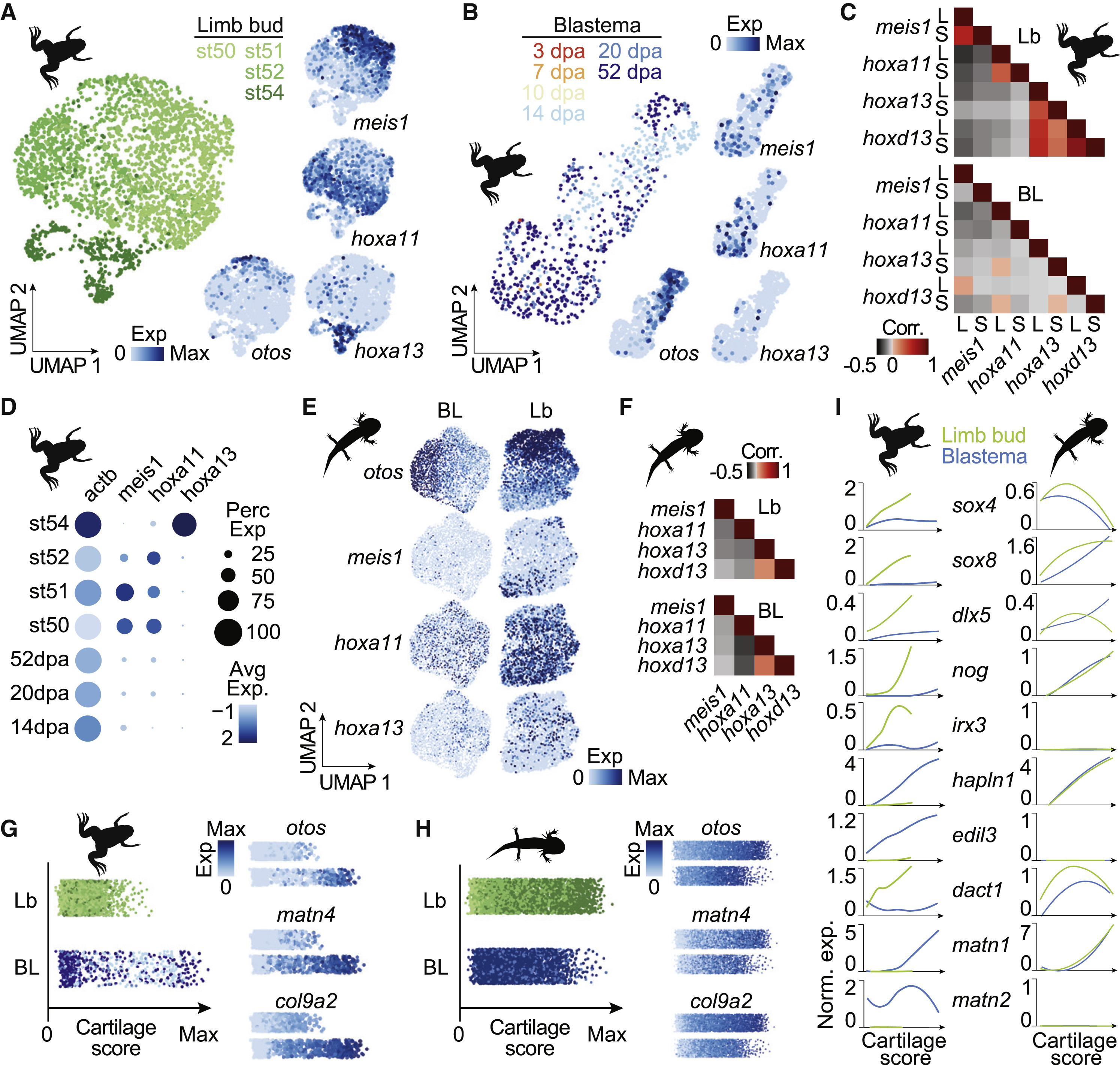 Figure 4. Proximal-distal stratification of patterning factors during cartilage formation in axolotl blastema and tadpole limb buds, but not in froglet blastema(A) UMAP embedding of scRNA-seq data from limb bud cartilage cells ranging from stage 50 to stage 54 limb buds. Cells are colored by limb bud stages. Feature plots (right) show the expression of maturing cartilage marker (otos) and proximal-distal patterning factors (meis1, hoxa11, hoxa13). Cartilage cells were isolated based on the clustering of cells in Figure S4R.(B) UMAP embedding of scRNA-seq data from frog blastema cartilage cells with cartilage cells being isolated based on the clustering of cells in Figure 2A. Cells are colored by blastema time points. Expression of otos, meis1, hoxa11, and hoxa13 are visualized as feature plots.(C) Correlation matrix for proximal-distal patterning genes in the developing cartilage of tadpole limb bud (Lb, top) and frog blastema (BL, bottom).(D) Dot plot showing gene expression intensity and frequency differences between developing cartilage cells in the tadpole limb bud and the frog blastema. Avg Exp: average expression values, Perc Exp: percent of cells expressing each gene. See Figures S4S and S4T for more information.(E) Feature plots showing expression level of otos, meis1, hoxa11 and hoxa13 on UMAP embeddings of scRNA-seq data from the cartilage cells of an 18-dpa axolotl blastema (BL, left) and limb buds (Lb, right). Cartilage cells were isolated based on the clustering of cells in Figure S4U.(F) Correlation matrix for proximal-distal patterning genes in the developing cartilage cells of an 18-dpa axolotl blastema (BL, bottom) and axolotl limb buds (Lb, top).(G) Cartilage scores (x axis) of frog limb bud (Lb, green) and blastema (BL, blue) cells, respectively, based on common markers of cartilage development (left, see STAR methods). Cells are colored by sample with colors matching the ones in (A) and (B) and are jittered along the y axis. Right: Exemplary feature plots of common cartilage development markers.(H) Cartilage scores (x axis) of axolotl limb bud (Lb, green) and blastema (BL, blue) cells, respectively, based on common markers of cartilage development (left, see STAR methods). Cells are colored by sample with colors matching the ones in Figure S4U and are jittered along the y axis. Right: exemplary feature plots of common cartilage development markers.(I) Gene expression as a function of cartilage score for selected genes identified to be differentially expressed between frog limb bud and blastema cartilage differentiation is visualized for frog (left) and axolotl (right) limb bud and blastema cartilage cells. A loess fitted curve through the data points is shown. Green: limb bud. Blue: blastema. |