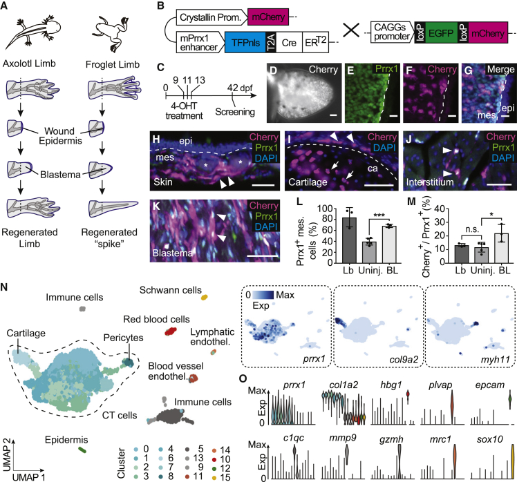Figure 1. Connective tissue cells are source cells of the adult frog blastema (A) Schematic comparison of limb regeneration after amputation in axolotls versus post-metamorphic frogs. Axolotls regenerate a complete limb while post-metamorphic frogs form a blastema but generate an abortive cartilage spike. (B) Schematic illustration of the Prrx1:CreER line (left) and the CAGGs:lp-Cherry reporter line (right). The CreER cassette was codon optimized and each genotype was generated individually with the REMI protocol (see STAR methods for details). Germline transmitted Prrx1:CreER founders were mated with a CAGGs:lp-Cherry reporter line. The F1 carrying both CreER and reporter cassettes were screened and used for the experiments in this study. (C) 4-hydroxytamoxifen (4-OHT) treatment paradigm used to convert the reporter cassette in F1. (D) Whole-mount image of mCherry fluorescence of a hindlimb bud from a converted Prrx1:CreER;CAGGs:lp-Cherry transgenic stage 51 tadpole. Proximal: left; Distal: right. Scale bar represents 20 μm. (EâG) Magnified fluorescence images of a longitudinal section of (D) immunostained for Prrx1 (mesenchymal CT cells, green) (E), Cherry (converted cells, magenta) (F), and the merged image with DAPI (nuclei, blue) (G). White dashed line denotes the border between Prrx1-positive mesenchyme (mes) and Prrx1-negative epidermis (epi). mCherry-expressing cells are confined to mesenchyme. Scale bars represent 20 μm. (H) Transverse section of uninjured upper hindlimb skin from a converted Prrx1:CreER;CAGGs:lp-Cherry transgenic froglet, immunostained for Cherry (converted cells, magenta), Prrx1 (dermal CT cells, green), and DAPI (nuclei, blue). White arrowheads indicate examples of converted dermal fibroblasts identified as Cherry- and Prrx1-double positive cells at the mesenchyme (mes)-epidermis (epi) border (white dashed line). Asterisks indicate non-specific tissue autofluorescence. Scale bars represent 50 μm. (I) Transverse section of cartilage region from a converted Prrx1:CreER;CAGGs:lp-Cherry transgenic froglet, immunostained for Cherry (converted cells, magenta) and DAPI (nuclei, blue). White dashed line denotes the border of cartilage (ca). White arrows indicate examples of converted Cherry-positive chondrocytes and white arrowheads the converted perichondria. Scale bars represent 50 μm. (J) Transverse section of muscle bundle region from a converted Prrx1:CreER;CAGGs:lp-Cherry transgenic froglet, immunostained for Cherry (converted cells, magenta), Prrx1 (interstitial CT cells, green), and DAPI (nuclei, blue). White arrowheads indicate examples of converted interstitial fibroblasts identified as Cherry- and Prrx1-double positive cells. Scale bars represent 50 μm. (K) Magnified fluorescence image of a longitudinal section of a 28 dpa blastema from a converted Prrx1:CreER;CAGGs:lp-Cherry transgenic froglet, immunostained for Cherry (converted cells, magenta), Prrx1 (blastema CT cells, green), and DAPI (nuclei, blue). Arrowheads show examples of the Prrx1-converted Cherry-positive cells contributing to the blastema. Scale bars represent 50 μm. (L) Percentage of Prrx1-expressing mesenchymal cells in limb buds (Lb, 84.4% ± 17.7%, n = 3), uninjured leg (Uninj, 39.9% ± 5.6%, n = 5), and blastema (BL, 68.2% ± 3.0%, n = 3), determined by immunohistochemistry. Statistical significance is calculated using unpaired Studentâs t test. âââp < 0.001. Data are represented as mean ± SD. (M) Percentage of converted Cherry+ CT precursors (Cherry+/Prrx1+) in limb buds (Lb, 13.2% ± 1.2%, n = 3), uninjured leg (Uninj, 11.7% ± 3.6%, n = 5), and blastema (BL, 22.0% ± 6.5%, n = 3), determined by immunohistochemistry. Statistical significance is calculated using unpaired Studentâs t test. n.s.: p > 0.05; âp < 0.01. Data are represented as mean ± SD. (N) Uniform manifold approximation and projection (UMAP) embedding of scRNA-seq data of 3,817 cells from a 14-dpa frog blastema. Cells are colored by cluster and cell type annotations are noted. Insets show the expression of blastema cells with a CT signature (prrx1), pericyte (myh11), and cartilage (col9a2) markers projected onto the UMAP embedding. (O) Violin plots show the expression of canonical marker genes defining cluster cell type annotations in the 14 dpa blastema as shown in (N). |