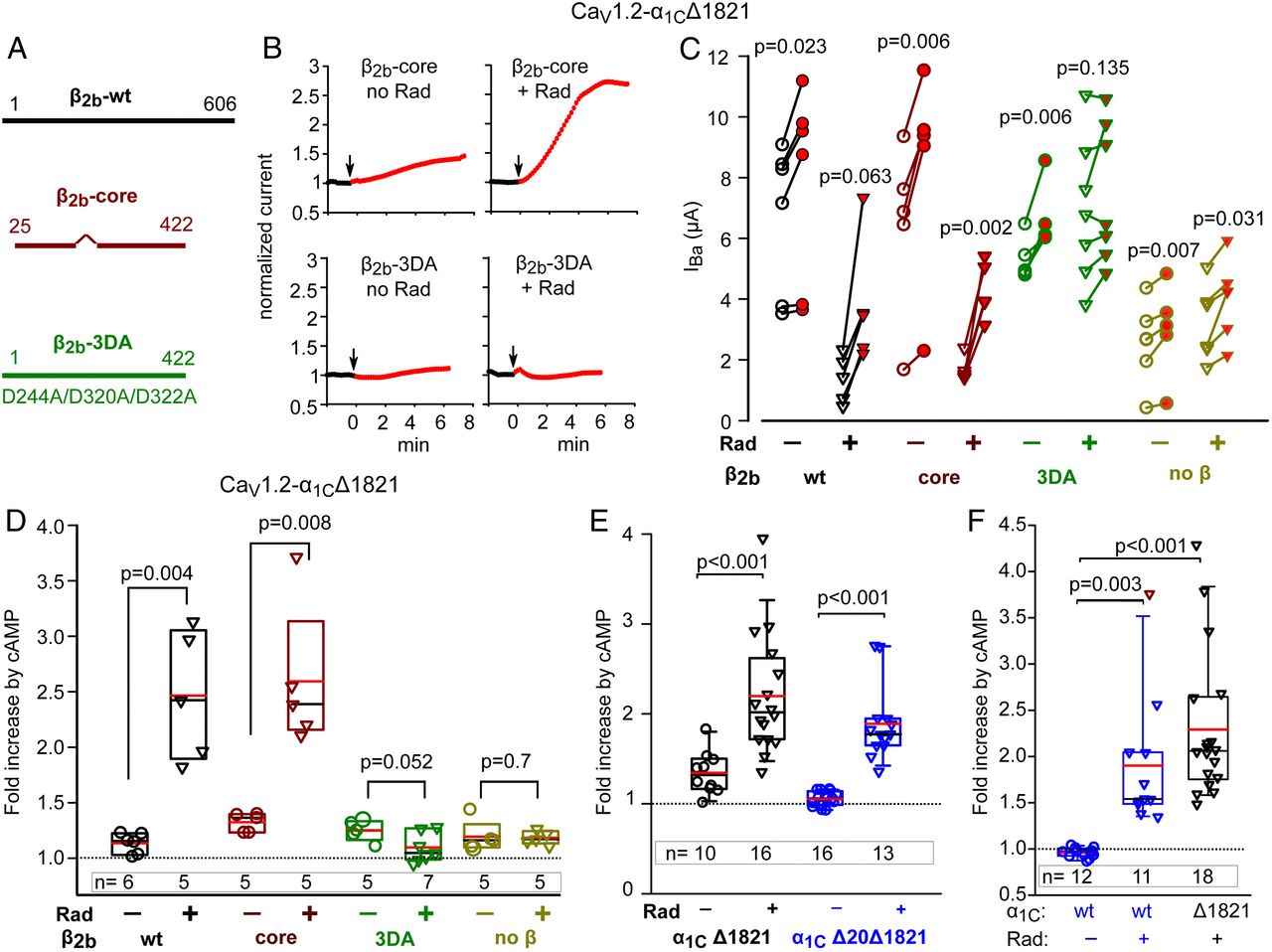 Separation of Rad-dependent and Rad-independent PKA regulation of α1C. In all experiments, Rad:β2b RNA ratio was 1:2 or 1:1. (A) Schematic representation of CaVβ variants used. The wild-type (β2b-wt) protein is 606 a.a. long. β-core was truncated at a.a. 422; the linker a.a. 138 to 202 were removed (38). The β2b-3DA is the β2b truncated at a.a. 422, with three Asp-to-Ala mutations, D244A/D320A/D322A. (B–D) the presence of the β subunit and its ability to bind Rad are crucial for Rad-dependent but not for Rad-independent cAMP regulation of CaV1.2. 1 experiment. (B) Diary plots of cAMP-induced changes in IBa (see SI Appendix, Fig. S1 for additional examples). (C) Before–after plots of cAMP-induced changes in IBa. Statistics: paired t test. (D) Summary of data from C. Data show the fold increase with Rad coexpression (inverted triangles) and without Rad (circles). Groups with and without Rad were compared by Mann–Whitney U Rank Sum test (t test for β2b-3DA groups in which normality was satisfied). (E) The role of N-terminal initial segment of α1C. Data shown are cAMP-induced changes in IBa in individual cells expressing CaV1.2-α1CΔ1821 (black) and CaV1.2-α1CΔ20Δ1821 (red; the latter is lacking the first 20 a.a. of the N terminus), with α2δ and β2b, without or with Rad. Refer to SI Appendix, Fig. S1B for raw data. Three experiments; statistics: Mann–Whitney U test. (F) The role of dCT of α1C. Data show the fold increase in IBa after cAMP injection (raw data are shown in SI Appendix, Fig. S1 C and D). Cells expressed the full length α1C (α1Cwt) or α1CΔ1821, α2δ and β2b, without or with Rad. Three experiments; statistics: Kruskal–Wallis test; H = 27.017 with 2 degrees of freedom, P = |