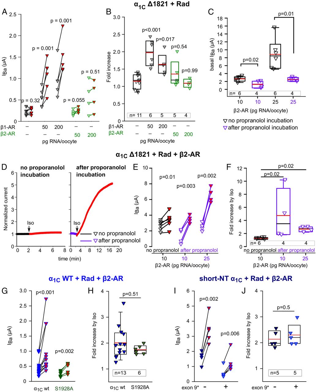 β2 adrenergic regulation of CaV1.2. (A and B) Unlike β1-AR, β2-AR does not up-regulate CaV1.2Δ1821 when activated by Iso. Rad:β2b RNA ratio was 1:2. Records were taken from oocytes of the same batch during a 3-d experiment. DNAs of both receptors were in pGEM-HJ vector. (A) Before-after plots and (B) summary of Iso-induced changes in IBa, without or with either β1-AR or β2-AR. Statistics: A, paired t test; B, one-way ANOVA (F = 9.9, P C) Basal IBa of CaV1.2Δ1821 is reduced by preincubation with propranolol for 60 to 120 min (10 µM; purple symbols). Rad:β2b RNA ratio was 1:2. One experiment; statistics: t test. (D–F) Iso regulates CaV1.2 via β2-AR following reduction in constitutive activity of the receptor by propranolol preincubation. Representative diary plots (D), Before-after plots (E) and summary of Iso-induced increase in oocytes coexpressing α1CΔ1821, Rad, and β2-AR without and with preincubation with propranolol. One experiment, statistics: paired t test (E), Kruskal–Wallis one-way ANOVA (H = 9.6, P = 0.001) followed by Dunnett’s test (F). (G and H) The S1928A mutation in the distal CT of full-length α1C does not abrogate the β2-AR regulation. Oocytes expressed α1C-WT or α1C-WT S1928A, β2b, α2δ, Rad, and β2-AR and were preincubated in propranolol prior to Iso challenge. Raw data from three experiments are shown in before–after plot (G; statistics: paired t test) and the summary is in H (statistics: Mann–Whitney U test). (I and J) β2-adrenergic regulation of short-NT isoforms of α1C, with or without exon 9*. Oocytes expressed short-NT α1C-wt with or without exon 9*, β2b, α2δ, Rad, and β2-AR and were preincubated in propranolol prior to Iso challenge. Raw data from one experiment are shown in before–after plot (I; statistics: paired t test), and the summary is in J (statistics: t test). |