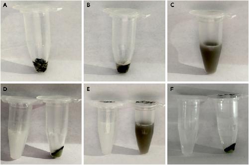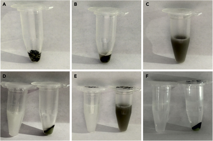 Figure 2. The main steps of extracts preparation(A) 60 embryos collected in Eppendorf tube to obtain crude extract (step 2)(B) Crude extract after centrifugation of embryos (step 3)(C) Crude extract, diluted 10 times with buffer N, before centrifugation(D) Separated fractions: left -cytoplasmic fraction, right - the pellet containing the cell nuclei (step 4)(E) Separated fractions before washing: on the left, the cytoplasmic fraction in buffer E (150 mM KCl), on the right, the nuclei in buffer with 0.8 M sucrose (step 5).(F) Fractions after extraction in buffer E and centrifugation: on the left is a cytoplasmic extract without any pellet, on the right is a nuclear extract containing a pellet of pigment and insoluble material.