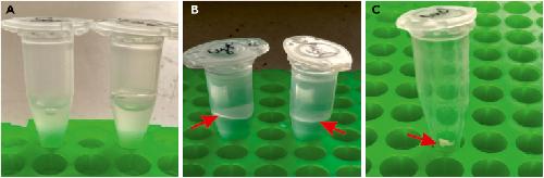 Figure 3. Methanol/chloroform protein precipitation(A) The resulting nuclear (right) and cytoplasmic (left) extracts.(B) Methanol/chloroform precipitation. The protein layer appears on the interface between the methanol/water and chloroform phases (step 9, b).(C) The protein pellet is collected at the bottom of the tube (step 9,e).