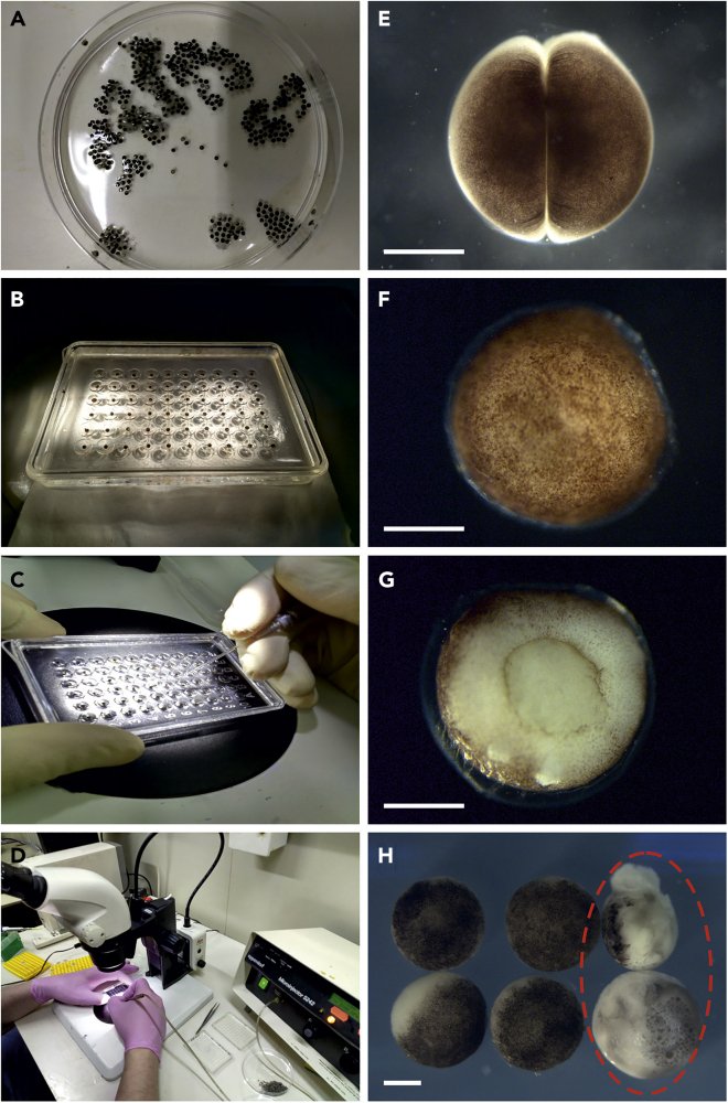 Figure 1. The main steps of embryo preparation(A) Fertilized eggs before cleavage begins.(B) Embryos in Terasaki plates before manipulation.(C)Capillary preparation for microinjection.(D) Microinjection in embryos: general view of the workspace.(E) Two-cell stage embryo.(F) Embryo at the gastrula stage (stage 12), top (animal) view.(G) Embryo at the gastrula stage (stage 12), bottom (vegetal) view.(H) Alive (four on the left) and dead (two on the right, indicated by a red dashed line) embryos.Scale bars are 500 μm.