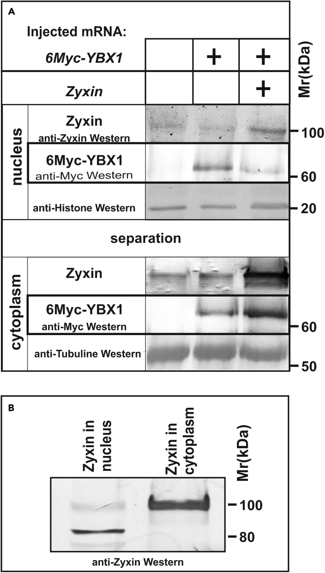 Figure 4. Examples of using the protocol for separating the nuclear and cytoplasmic fractions to study changes in the localization and mobility of the cytoskeletal protein Zyxin and its effect on the localization of the transcription factor Ybx1(A) While Zyxin reduces the nuclear concentration of 6Myc-Ybx1, it increases the cytoplasmic concentration of 6Myc-Ybx1. Xenopus laevis embryos at the 2–4 cell stage were injected with either 6 myc-ybx1 (200 pg per blastomere) and zyxin (300 pg per blastomere) or only 6 myc-ybx1 mRNA (200 pg per blastomere) and incubated at 18°C until the late gastrula stage. Nuclear and cytoplasmic fractions and precipitated samples were prepared as described in the protocol. The samples were analyzed by SDS-PAGE in a 10% gel according to the method of Laemmli and electroblotted onto PVDF membranes. Detection was performed with the following antibodies: monoclonal anti-Myc alkaline phosphatase conjugated antibodies (Sigma) for Myc-tagged protein Ybx1 and anti-Zyxin rabbit polyclonal monospecific antibodies for Zyxin (Figure reprinted with permission from Parshina et al. 2020).(B) Changes in the mobility of the band corresponding to Zyxin upon separation into nuclear and cytoplasmic fractions. An equal volume of 4× SDS Laemmli sample buffer was added to 50 μL of the obtained nuclear and cytoplasmic extracts, and then, the samples were boiled for 10 min at 80°C. The samples were analyzed by SDS-PAGE in 7.5% Laemmli gels and electroblotted onto a PVDF membrane. Detection was carried out using rabbit polyclonal monospecific antibodies against the C-terminal Lim domain of Zyxin.