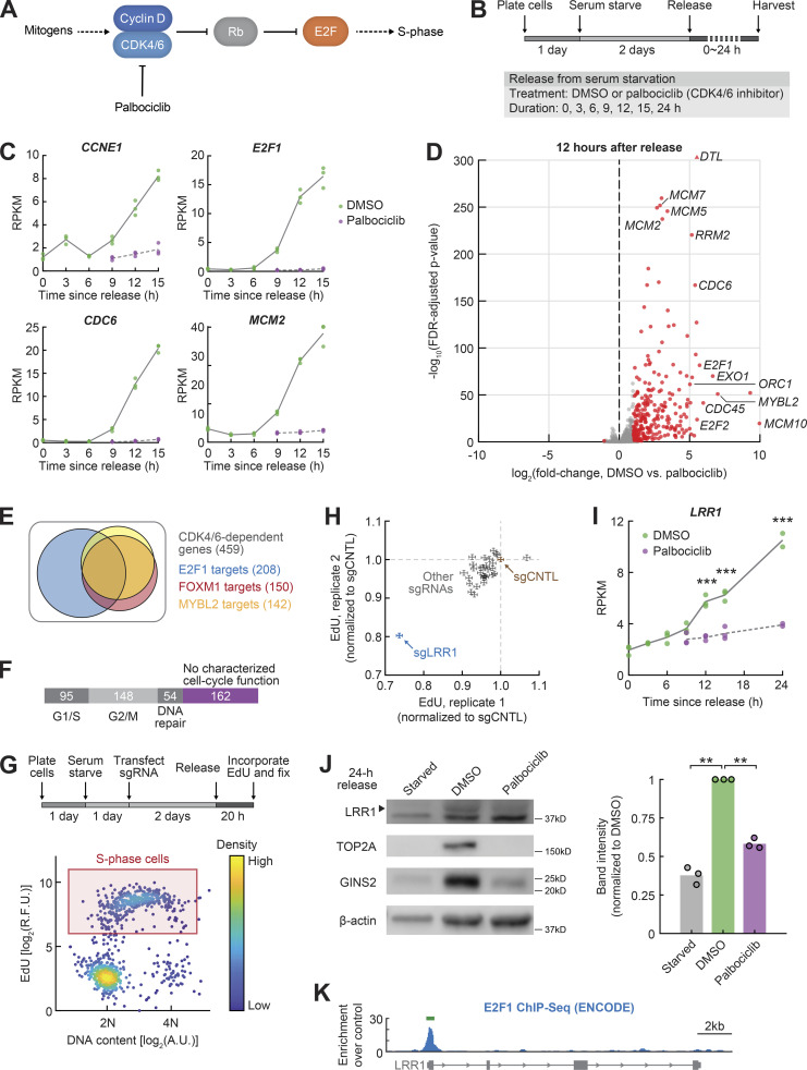 Figure 1. Identification of LRR1 as a regulator of S-phase progression based on RNA-Seq analysis and a targeted CRISPR screen.(A) Cell-cycle entry pathway in mammalian cells. Rb, retinoblastoma protein. (B) Schematic of experimental setup for RNA-Seq. (C) Examples of gene expression time course measured by RNA-Seq. Each time point contains three independent experiments. RPKM, reads per kilobase of transcript per million mapped reads. (D) Volcano plot from differential expression analysis of three independent experiments. Differentially expressed genes (|log2[fold-change]| > 1, adjusted P value < 0.1) are highlighted. Labeled genes are examples of reported E2F targets (Bracken et al., 2004). FDR, false discovery rate. (E) Venn diagram of CDK4/6–dependent genes that are targets of E2F1, FOXM1, or MYBL2 (ENCODE ChIP-Seq datasets; see Materials and methods for details). (F) Manually annotated function of CDK4/6–dependent genes. (G) Top: Experimental setup. Bottom: Schematic of gating for S-phase cells (n = 3,000 random cells displayed). A.U., arbitrary unit; R.F.U., relative fluorescence unit. (H) Rate of EdU incorporation was measured in S-phase cells as the median nuclear intensity and was normalized to control cells (sgCNTL). Error bars are population medians with 95% confidence intervals (n ≥ 8,659 cells per condition). (I) LRR1 gene expression time course measured by RNA-Seq. Each time point contains three independent experiments (two experiments for 24-h time point). (J) Left: Serum-starved cells were released in the presence of DMSO or palbociclib, harvested, and blotted for LRR1 and known E2F targets TOP2A and GINS2. Arrowhead indicates LRR1-specific band; the other band is a nonspecific band. Right: Quantification of Western blots (relative to actin loading control), normalized to DMSO conditions. Paired Student’s t test; P = 8.0 × 10−3, 3.7 × 10−3 (n = 3 independent experiments). (K) E2F1 ChIP-Seq signal (blue plot, ENCODE ENCFF009LGS; data are representative of two independent experiments) and detected peaks (green line, ENCODE ENCFF998YJY, irreproducible discovery rate cutoff = 0.05). In all panels, **, P < 0.01; ***, P < 0.001. |
