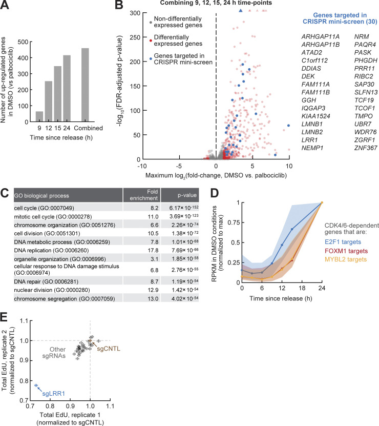 Figure S1. RNA-Seq analysis of CDK4/6 activity-regulated genes in MCF10A cells (related to Fig. 1). (A) Number of up-regulated genes in DMSO-treated cells compared with palbociclib treatment (log2[fold-change] > 1, adjusted P value < 0.1). (B) Volcano plot from differential expression analysis. Differentially expressed genes (|log2[fold-change]| > 1, adjusted P value < 0.1 at any time point) are highlighted in red. Genes targeted in CRISPR screen are highlighted in blue. Triangles indicate genes that lie outside the maximum y-axis range. (C) GO term analysis of CDK4/6–dependent genes. Processes are sorted by false discovery rate (FDR)–adjusted P value. Redundant processes are omitted. (D) Gene expression time course for CDK4/6–dependent genes that are also E2F1, FOXM1, or MYBL2 targets. For each gene, average expression of DMSO-treated cells at each time point was normalized to maximum expression of that gene. Line plots are medians of genes; shaded error bars indicate 25th to 75th percentile (n = 208, 150, and 142 targets for E2F1, FOXM1, and MYBL2, respectively; n = 3 independent experiments). (E) Same experiment as Fig. 1 H. Rate of EdU incorporation was measured in S-phase cells as the total EdU fluorescence in the nucleus and normalized to control cells (sgCNTL). Error bars are population medians with 95% confidence intervals (n ≥ 8,725 cells per condition). RPKM, reads per kilobase of transcript per million mapped reads. |