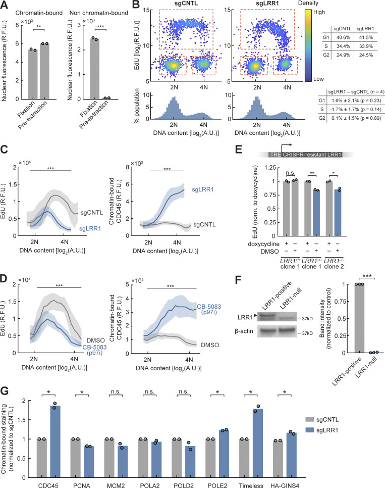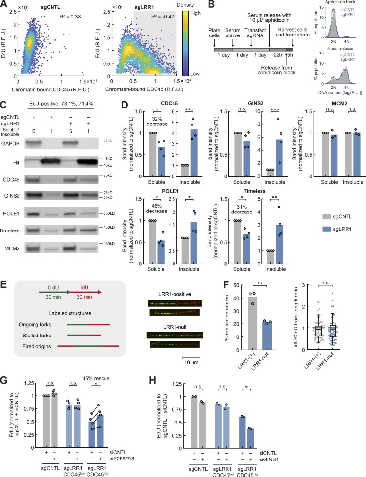 Figure 3. Failure to disassemble replisomes after LRR1 loss suppresses DNA replication by blocking the recycling of replication factors.(A) Continuously cycling Cas9 cells were transfected with sgRNAs and fixed 1 d later. Scatter plot of rate of EdU incorporation against abundance of chromatin-bound CDC45 in S-phase cells (n = 3,000 random cells displayed). Left: R2 = 0.38, P < 1 × 10−3. Right: Shaded area represents cells with high chromatin-bound CDC45, where R2 = −0.47, P < 1 × 10−3. Data are representative of four independent experiments. (B) Left: Experimental setup. Right: Distribution of DNA content (n ≥ 17,152 cells per condition). (C) Cells were released for 5 h from an aphidicolin block and harvested. Detergent-soluble (S) and insoluble (I) proteins were fractionated and immunoblotted. Soluble and insoluble fractions were loaded at a ratio of 1:2. Data are representative of four independent experiments. (D) Quantification of Western blots (relative to GAPDH or H4 loading controls) normalized to control cells. Paired Student’s t test; CDC45: P = 0.045, 7.1 × 10−4; GINS2: P = 0.15, 0.014; POLE1: P = 0.011, 0.040; Timeless: P = 0.014, 7.0 × 10−3; and MCM2: P = 0.53, 0.78 (n = 4 independent experiments). (E) Left: Schematic of DNA fiber assay. LRR1 was depleted in LRR1−/− cells expressing exogenous, doxycycline-inducible LRR1. Right: Sample images from DNA fiber assay. (F) Quantification of DNA fiber assay. Left: Percentage of total labeled structures that are replication origins. Two-sample Student’s t test; P = 1.9 × 10−3 (n = 3 independent experiments, n ≥ 28 labeled structures per condition). Right: Ratio of IdU/CldU track lengths. Box plots represent the interquartile range (IQR), while whiskers represent the nonoutlier minimum and maximum; outliers are values that are more than 1.5 × IQR away from box edges. Two-sample Student’s t test, P = 0.80; two-sample Kolmogorov-Smirnov test, P = 0.51 (data pooled from n = 3 independent experiments, n = 85 and 70 labeled tracks per condition). (G) Rate of EdU incorporation in S-phase cells normalized to control cells (sgCNTL + siCNTL). Cells were categorized as CDC45low (unsuccessful knockout) or CDC45high (successful knockout) based on the abundance of chromatin-bound CDC45. Paired Student’s t test; P = 0.10, 0.77, 0.011 (n = 4 independent experiments, n ≥ 198 cells per condition). (H) Rate of EdU incorporation in S-phase cells normalized to control cells (sgCNTL + siCNTL). Paired Student’s t test; P = 0.10, 0.27, 0.025 (n = 2 independent experiments, n ≥ 25 cells per condition). A.U., arbitrary unit; R.F.U., relative fluorescence unit. In all panels, *, P < 0.05; **, P < 0.01; ***, P < 0.001. |