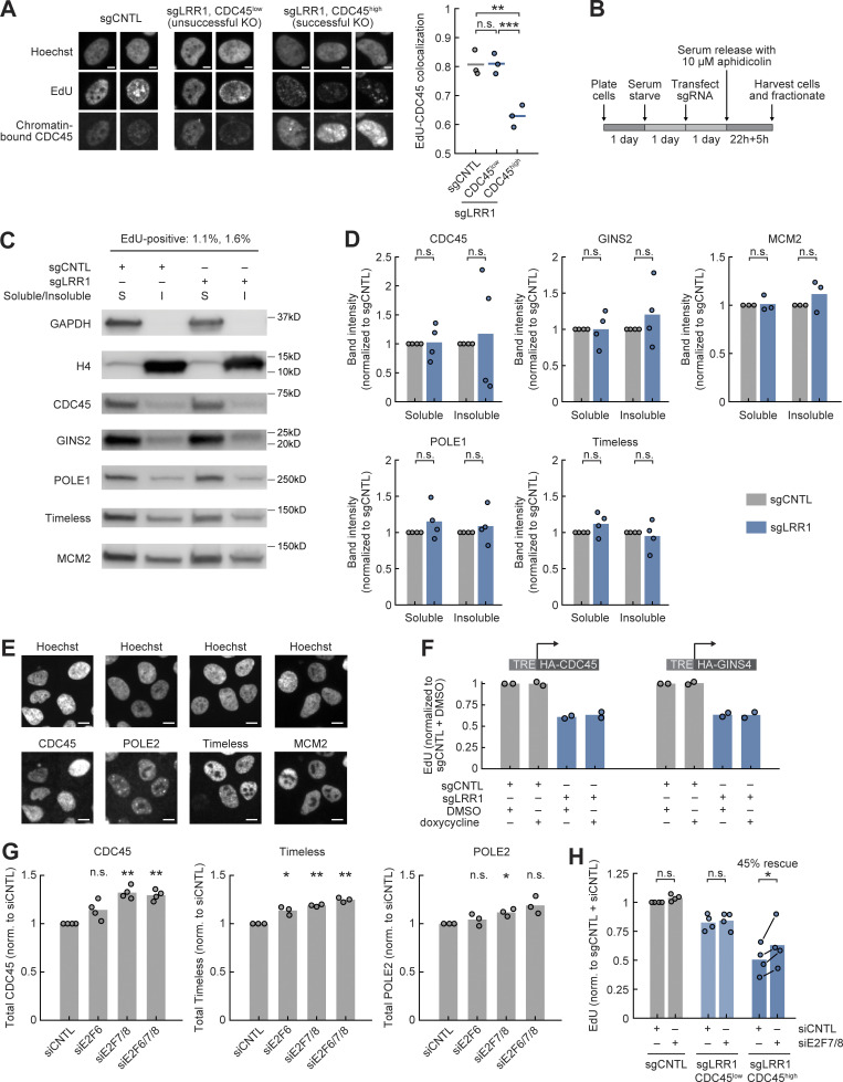 Figure S4. Control experiments supporting the defective recycling model (related to Fig. 3).(A) Left: Sample immunofluorescence images of S-phase cells. In sgCNTL and sgLRR1 (CDC45low) cells, EdU and CDC45 stains were largely colocalized, whereas the stains were less colocalized in sgLRR1 (CDC45high) cells. Scale bar: 5 µm. Right: Colocalization of EdU and CDC45 stains was quantified in each nucleus using pixel-level Pearson’s correlation coefficient. Paired Student’s t test; sgCNTL vs. sgLRR1 (CDC45low): P = 0.81; sgLRR1 (CDC45low) vs. sgLRR1 (CDC45high): P = 1.2 × 10−4; sgCNTL vs. sgLRR1 (CDC45high): P = 3.5 × 10−3 (n = 3 independent experiments, n ≥ 1,230 cells per condition). (B) Schematic of experimental setup for subcellular fractionation (control experiment for Fig. 3, B–D). Serum-starved cells stably expressing Cas9 were transfected with sgRNAs and released from starvation in the presence of 10 µM aphidicolin to synchronize cells at the G1/S transition. (C) Control and LRR1 knockout cells were not released from an aphidicolin block and harvested. Detergent-soluble (S) and insoluble (I) proteins were fractionated and immunoblotted. Soluble and insoluble fractions were loaded at a ratio of 1:2. Data are representative of four independent experiments. (D) Quantification of C and replicates (relative to GAPDH or H4 loading controls) normalized to control cells. Paired Student’s t test; CDC45: P = 0.95, 0.70; GINS2: P = 0.87, 0.50; POLE1: P = 0.31, 0.60; Timeless: P = 0.25, 0.59; MCM2: P = 0.84, 0.38 (n = 4 independent experiments). (E) Subcellular localization of total CDC45, POLE2, Timeless, and MCM2 measured by immunofluorescence. Scale bar: 10 µm. Data are representative of three independent experiments. CDC45, POLE2, Timeless, and MCM2 were all exclusively nuclear localized, suggesting that the detergent-soluble fraction of these replisome components reflects the nucleoplasmic pool rather than the cytoplasmic pool. (F) Rate of EdU incorporation in S-phase cells was normalized to control cells (n ≥ 25,192 cells per condition). Data from n = 2 independent experiments. Expressing exogenous CDC45 or GINS4 alone did not rescue the DNA replication defect after LRR1 knockout. This result suggests that additional rate-limiting components or a combination of rate-limiting components is sequestered on chromatin, which is consistent with subcellular fractionation results where multiple replication factors were depleted from the soluble pool (Fig. 3 D). This led us to rescue DNA replication defects in LRR1 knockout cells by de-repressing E2F activity (Fig. 3 G). (G) Total nuclear levels of CDC45, Timeless, and POLE2 were measured in S-phase cells and normalized to control cells. Paired Student’s t test; CDC45: P = 0.057, 1.4 × 10−3, 1.2 × 10−3 (n = 4 independent experiments, n ≥ 9,916 cells per condition); Timeless: P = 0.029, 1.3 × 10−3, 2.4 × 10−3 (n = 3 independent experiments, n ≥ 10,680 cells per condition); POLE2: P = 0.356, 0.032, 0.060 (n = 3 independent experiments, n ≥ 2,532 cells per condition). (H) Rate of EdU incorporation in S-phase cells normalized to control cells (sgCNTL + siCNTL). Cells were categorized as CDC45low (unsuccessful knockout) or CDC45high (successful knockout) based on the abundance of chromatin-bound CDC45. Paired Student’s t test; P = 0.069, 0.31, 0.015 (n = 4 independent experiments, n ≥ 164 cells per condition). KO, knockout; norm., normalized; TRE, tetracycline-responsive element. In all panels, *, P < 0.05; **, P < 0.01; ***, P < 0.001. |