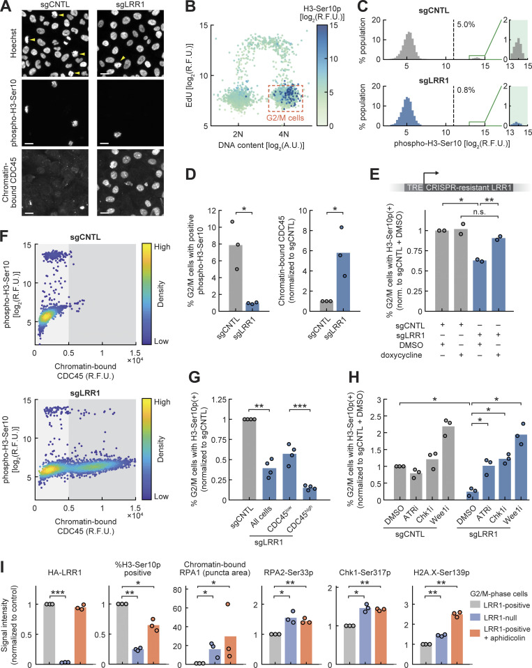 Figure 4. Persistent binding of CMG helicases to chromatin after LRR1 loss blocks mitosis by activating ATR–Chk1–Wee1.(A) Serum-starved Cas9 cells were transfected with sgRNAs, released from starvation, and fixed after 30 h. Sample immunofluorescence images are shown. Arrowheads indicate cells with positive phospho-H3-Ser10 signal. Scale bar: 20 µm. Data are representative of three independent experiments. (B) Schematic of gating for G2/M-phase cells (n = 3,000 random cells displayed). (C) Histogram of phospho-H3-Ser10 signal in G2/M cells (cutoff = 11, n ≥ 4,389 cells per condition). (D) Left: Percentage of G2/M cells with positive phospho-H3-Ser10 signal. Paired Student’s t test; P = 0.048 (n = 3 independent experiments, n ≥ 4,389 cells per condition). Right: Abundance of chromatin-bound CDC45 in G2/M-phase cells normalized to control cells. Paired Student’s t test; P = 0.021 (n = 3 independent experiments, n ≥ 4,389 cells per condition). (E) Continuously cycling Cas9 cells were transfected with sgRNAs and fixed 1 d later, as in F–H. Percentage of G2/M cells with positive phospho-H3-Ser10 signal normalized to control cells (sgCNTL + DMSO). Paired Student’s t test, columns 1 vs. 3: P = 0.027; columns 3 vs. 4: P = 6.9 × 10−3; columns 2 vs. 4: P = 0.20 (n = 2 independent experiments, n ≥ 4,132 cells per condition). (F) Scatter plot of phospho-H3-Ser10 signal against abundance of chromatin-bound CDC45 in G2/M-phase cells (n = 3,000 random cells displayed). Data are representative of three independent experiments. (G) Percentage of G2/M cells with positive phospho-H3-Ser10 signal was normalized to control cells. Cells were categorized as CDC45low or CDC45high based on the abundance of chromatin-bound CDC45 (see Fig. 4 F, light- and dark-shaded areas). Paired Student’s t test; P = 6.3 × 10−3, 8.4 × 10−5 (n = 4 independent experiments, n ≥ 1,322 cells per condition). (H) Cells were treated with the ATR inhibitor (ATRi; AZ20, 1 µM), Chk1 inhibitor (Chk1i; CHIR124, 500 nM), or Wee1 inhibitor (Wee1i; MK1775, 1 µM) for 4 h. Percentage of G2/M cells with positive phospho-H3-Ser10 signal was normalized to control cells (sgCNTL + DMSO). Paired Student’s t test; P = 0.041, 0.012, 0.037, 0.011 (n = 3 independent experiments, n ≥ 2,804 cells per condition). (I) LRR1 was depleted in LRR1−/− cells expressing exogenous, doxycycline-inducible LRR1. Positive control cells were treated with 10 µM aphidicolin for 3 h. The indicated protein markers were measured in G2/M cells through immunofluorescence, and nuclear signals were normalized to control cells (LRR1 positive). Paired Student’s t test; *, P < 0.05; **, P < 0.01; *** P < 0.001 (n = 3 independent experiments, n ≥ 4,000 cells per condition). A.U., arbitrary unit; norm., normalized; R.F.U., relative fluorescence unit; TRE, tetracycline-responsive element. In all panels, *, P < 0.05; **, P < 0.01; ***, P < 0.001. |