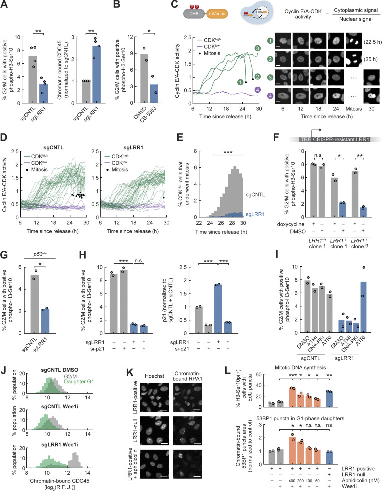 Figure S5. Analysis of the G2/M checkpoint and under-replicated DNA after LRR1 loss(related to Fig. 4). (A) Continuously cycling cells stably expressing Cas9 were transfected with sgRNAs and fixed 1 d later. Left: Percentage of G2/M cells with positive phospho-H3-Ser10 signal. Paired Student’s t test; P = 3.3 × 10−3 (n = 4 independent experiments, n ≥ 3,421 cells per condition). Right: Abundance of chromatin-bound CDC45 in G2/M-phase cells normalized to control cells. Paired Student’s t test; P = 1.3 × 10−3 (n = 4 independent experiments, n ≥ 3,421 cells per condition). (B) Cells were treated with DMSO or a p97 inhibitor (CB-5083, 4 µM) for 6 h. Percentage of G2/M cells with positive phospho-H3-Ser10 signal. Paired Student’s t test; P = 0.044 (n = 2 independent experiments, n ≥ 3,522 cells per condition). (C) Top: Schematic of cyclin E/A–CDK activity reporter. DHB is a fragment (aa 994–1087) of the human DHB protein. The reporter translocates to the cytoplasm when phosphorylated by cyclin E/A–CDK activity. Bottom: Cells expressing H2B-mTurquoise and the cyclin E/A–CDK activity reporter were released from serum starvation and imaged and further categorized as CDK-high if cyclin E/A–CDK activity rose above 0.85 for more than 1 h. Mitosis was monitored by the separation of condensed chromatin during anaphase (see bottom right sample images). Cells #1 and #2 underwent mitosis at 22.5 h and 25 h after release, respectively. Cells #3 and #4 did not undergo mitosis within 30 h after release. Scale bar: 10 µm. (D) Serum-starved cells stably expressing Cas9 were transfected with sgRNAs and released from starvation 2 d later. Cyclin E/A–CDK activity and mitotic time were measured (n = 50 sample traces displayed). Data are representative of three independent experiments. (E) Quantification of D. Percentage of CDKhigh cells that underwent mitosis is plotted as a function of time since serum release (n = 6,016 and 5,979 cells). Fisher’s exact test; ***, P < 1 × 10−3. Data are representative of three independent experiments. (F) Cells expressing CRISPR-resistant LRR1 from a doxycycline-inducible promoter were transfected with sgCNTL or sgLRR1 and selected for stable single-cell clones. Cells were cultured in doxycycline to maintain expression of exogenous LRR1. Percentage of G2/M cells with positive phospho-H3-Ser10 signal was measured after replacing doxycycline with DMSO or doxycycline for 1 d. Two-sample Student’s t test; P = 0.38, 0.016, 3.7 × 10−3 (n = 2 technical replicates, n ≥ 2,104 cells per replicate). (G) Effect of LRR1 knockout was measured in p53−/− cells. Percentage of G2/M cells with positive phospho-H3-Ser10 signal. Two-sample Student’s t test; P = 0.014 (n = 2 technical replicates, n ≥ 4,111 cells per replicate). (H) Serum-starved cells stably expressing Cas9 were transfected with sgRNAs, released from starvation 2 d later, and fixed after 30 h. Left: Percentage of G2/M cells with positive phospho-H3-Ser10 signal. Two-sample Student’s t test; P = 1.1 × 10−3, 0.11 (n = 2 technical replicates, n ≥ 5,807 cells per replicate). Right: Nuclear abundance of p21 in G2/M cells normalized to control cells (sgCNTL + siCNTL). Two-sample Student’s t test; P = 8.7 × 10−4, 1.0 × 10−4 (n = 2 technical replicates, n ≥ 5,807 cells per replicate). (I) Percentage of G2/M cells with positive phospho-H3-Ser10 signal after 4-h treatment with ATM inhibitor (ATMi; KU-60019, 5 µM), DNA-PK inhibitor (DNA-PKi; NU7441, 1 µM), or ATR inhibitor (ATRi; AZ20, 1 µM; n ≥ 4,648 cells per condition). Data from two independent experiments. (J) Histogram of chromatin-bound CDC45 in G1-phase daughter cells or G2/M cells after 4-h treatment with DMSO or Wee1 inhibitor (Wee1i; MK1775, 1 µM; n ≥ 356 cells per condition). Data are representative of two technical replicates. (K) Sample immunofluorescence images from experiment in Fig. 4 I. Scale bar: 20 µm. Data are representative of three independent experiments. (L) LRR1 was depleted in LRR1−/− cells expressing exogenous, doxycycline-inducible LRR1 by removing doxycycline and transfecting siRNA targeting exogenous LRR1 1 d before fixation. As a positive control, cells were treated with the indicated concentration of aphidicolin for 16 h. Top: Cells were treated with Wee1 inhibitor (MK1775, 1 µM) for 1 h and pulse labeled with EdU for 10 min. EdU puncta area was quantified in mitotic cells with positive phospho-H3-Ser10 signal. Two-sample Student’s t test; P = 7.2 × 10−4, 0.047, 0.038, 0.025, 1.5 × 10−3 (n = 2 technical replicates, n ≥ 209 cells per condition). Bottom: Cells were treated with Wee1 inhibitor (MK1775, 1 µM) for 3 h, and chromatin-bound 53BP1 puncta area was quantified in G1-phase daughter cells born after Wee1 inhibition. Two-sample Student’s t test; P = 0.0498, 0.030, 0.32, 0.77, 0.090 (n = 2 technical replicates, n ≥ 582 cells per condition). R.F.U., relative fluorescence unit; TRE, tetracycline-responsive element. In all panels, *, P < 0.05; **, P < 0.01; ***, P < 0.001. |