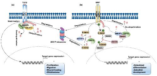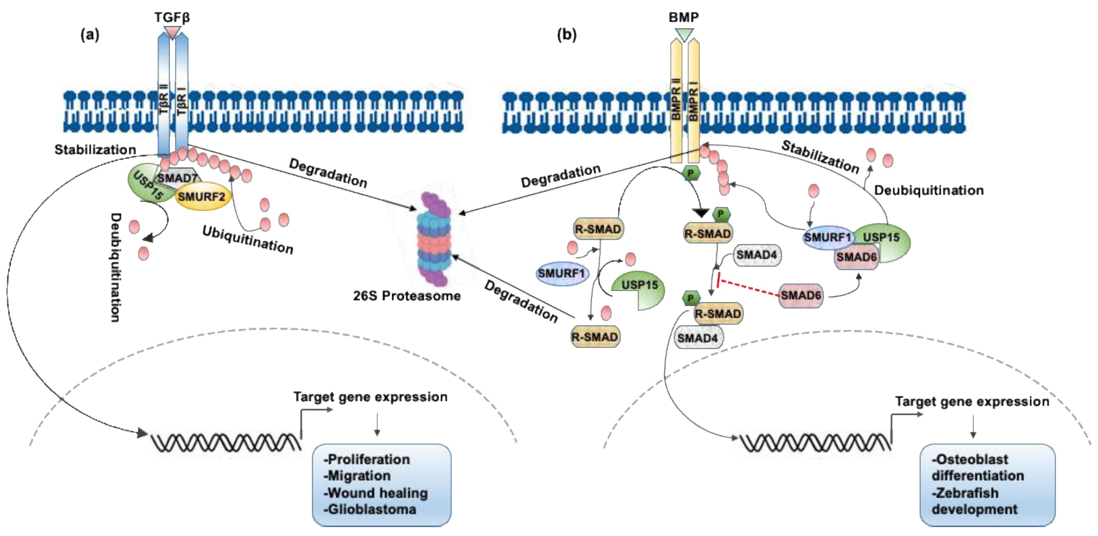 Figure 1. USP15 in the regulation of TGF-β and BMP signaling. (a) USP15 binds to SMAD7 and opposes SMURF2-mediated ubiquitination of TβRI. The deubiquitination and stabilization of TβRI by USP15 promotes TGF-β activity and triggers the downstream gene expression to stimulate cell proliferation, migration wound healing, and glioblastoma pathogenesis [13]. (b) Upon activation by BMP ligands, the receptor-regulated R-SMADs undergo phosphorylation, bind to SMAD4, and enter the nucleus to induce target gene transcription. SMAD6 is a negative regulator that competes with SMAD4 to bind to R-SMADs and induces SMURF1-mediated ubiquitination and degradation of R-SMADs. Through its interaction with SMAD6, USP15 deubiquitinates and stabilizes BMPR1 and R-SMADs to enhance the BMP signaling and elicit target gene expression [39] |
