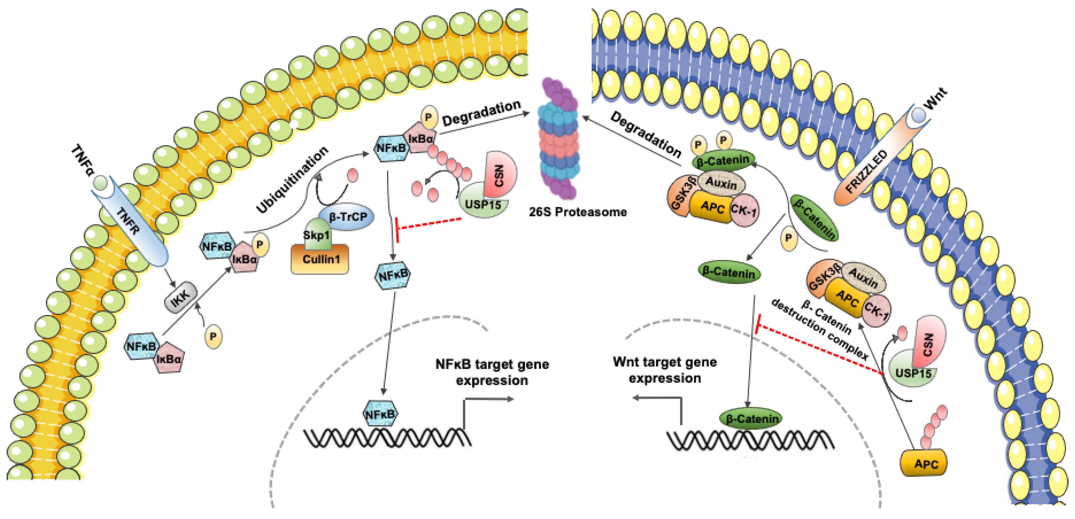 Figure 2. USP15 suppresses TNFα and Wnt signaling in association with CSN. Upon stimulation by TNFα, NF-ĸB is activated through phosphorylation and ubiquitin-dependent degradation of IĸB by CRL/SCFβTrCP E3 ubiquitin ligase to turn on its downstream target genes. USP15, in association with CSN, deubiquitinates and promotes IĸB stabilization by inhibiting CRL/SCFβTrCP activity and hinders NF-ĸB signaling (left) [33]. USP15 negatively regulates Wnt/β-catenin signaling by promoting the formation of the β-catenin destruction complex. In association with CSN, USP15 deubiquitinates and induces the stability of the essential component of the β-catenin destruction complex APC, which is required to target the phosphorylated β-catenin for CRLβ-TrCP-dependent proteasomal degradation (right) [35]. |