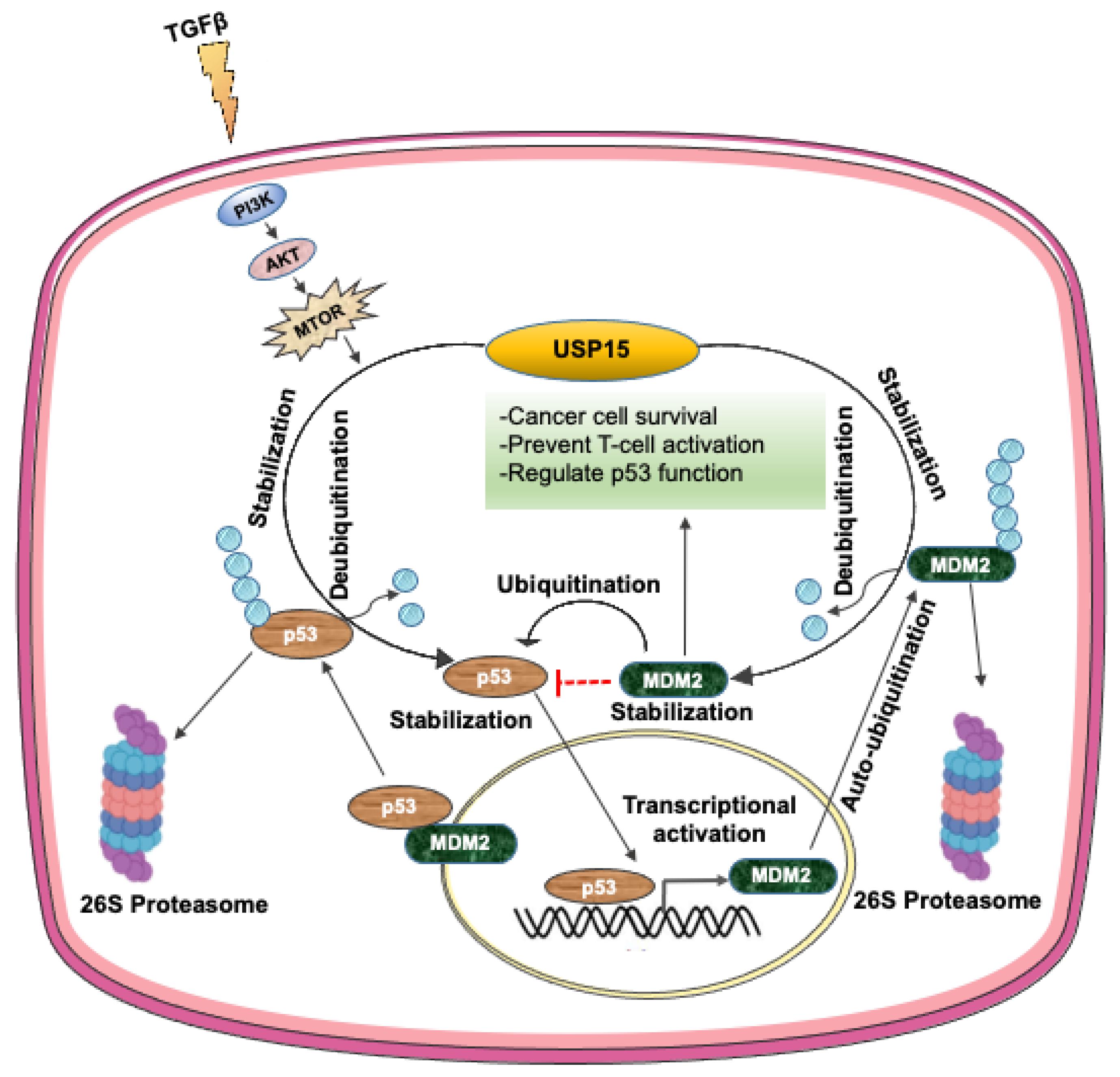 Figure 3. Regulation of p53 signaling by USP15. USP15 translation is upregulated by TGF-β through the PI3K/AKT pathway, which in turn increases the stabilization of p53 by its deubiquitination and activates p53 signaling. In another way, USP15 also promotes the ubiquitin-dependent degradation of p53 by deubiquitination and enhanced stabilization of the E3 ubiquitin ligase for p53, MDM2, resulting in the downregulation of p53 target gene expression [34,84]. |