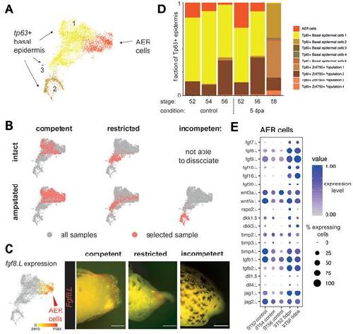Fig. 2. Formation of a signalling centre comprising apical-ectodermal-ridge (AER) cells is associated with the successful regeneration. (A) Multiple basal epidermal cell states are detected, including AER cells, in the pooled dataset. (B) UMAP visualization of basal epidermis reveals that re-establishment of AER cells is associated with successful regeneration. Red dots indicate cells in the selected sample; grey dots indicate cells in all samples. (C) Left: UMAP visualization of pooled data for AER cells expressing Fgf8.L. Right: stereomicroscope images of the 5â dpa amputation plane of regeneration-competent, -restricted and -incompetent tadpoles. Fgf8.L-expressing AER cells (red) are formed in regeneration-competent and -restricted tadpoles, but not in regeneration-incompetent tadpoles. Scale bars: 250â μm. (D) The abundance of basal epidermal cell types across conditions reveals a correlation between AER abundance and regeneration outcome. AER cells are present in intact regeneration-competent samples, and are enriched after amputation. A similar pattern is seen in regeneration-restricted samples, although abundances of AER cells are reduced. Very few AER cells are detected in regeneration-incompetent tadpoles. (E) Dot plot showing expression of selected ligands for AER cells during development and at 5â dpa in regeneration-competent and -restricted samples. Dot colour indicates mean expression; dot size represents the percentage of cells with non-zero expression. |