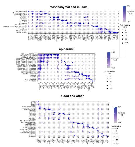 Figure S5: Annotation of cell types using known markers of cell identity. Dotplots showing marker genes for each of the 61 cell types in our atlas. For ease of presentation, we group cell types into three broad categories: mesenchymal and muscle (top), epidermal (middle), blood and other (bottom). Please note that for the AER cell cluster, we also provide marker gene expression for specific samples as indicated. Dot color denotes mean expression level within the cluster; dot size denotes the percentage of cells within the cluster with non-zero expression. |