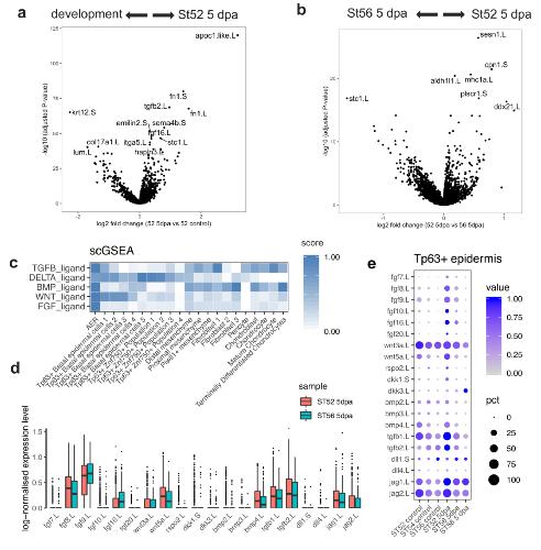 Figure S6: AER cells are a signaling center population. Differentially expressed genes are detected in AER cells between pairs of conditions and visualised using volcano plots. In (a), Stage 52 5 dpa is compared to Stage 52 control samples; in (b), Stage 56 5dpa is compared to Stage 52 5dpa samples. (c) Heatmap showing single-cell gene enrichment scores for ligands from the main signaling pathways are shown for epidermal cell types. AER cells have high signal center properties as they express high levels of TGF-β, Delta, BMP, WNT, and FGF ligands. Please see Supplementary Table 2 for the full list of ligands used in this analysis. (d) Log10-normalized gene expression visualised using boxplots to compare expression levels between Stage 52 5 dpa and Stage 56 5 dpa AER cells. (e) Dot plot showing expression of AER cell associated selected ligands for TP63+ epidermal cells during development and at 5 dpa in regeneration-competent, -restricted, and âincompetent samples. Dot color indicates mean expression; dot size represents the percentage of cells with non-zero expression.â |