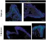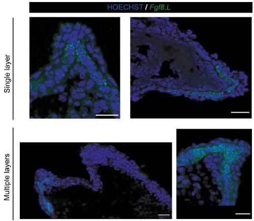 Figure S8: AER cells can be mono- or multi-layered structures. Fgf8.L images of sectioned in vivo 5 dpa samples from regeneration âcompetent (top) and â restricted (bottom) samples. Morphology of AER cells (Fgf8.L+) can vary between sections and samples. Top left, AER cells are seen as single monolayer largely cuboidal although some have higher height to width ratio. Top right, AER cells are seen as single monolayer largely cuboidal cells. Bottom left, AER cells can be seen as multi-layered population that is not covering the whole amputation plane. Bottom right, AER cells can be seen as multi-layered population covering the amputation plane. Blue, Hoechst; Green, Fgf8.L mRNA. Scale bars = 25 μm. |