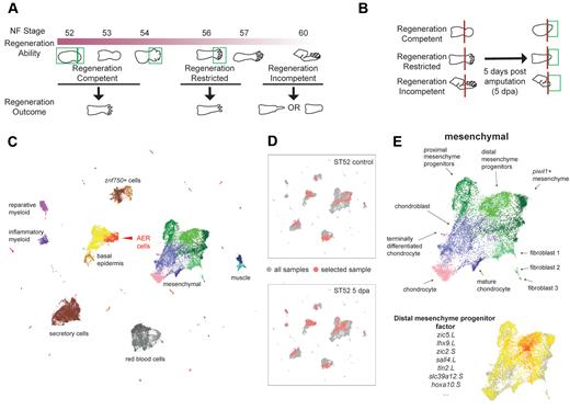 Fig. 1. Single-cell transcriptomics reveals cellular heterogeneity in developing and amputated Xenopus limbs at different stages of regeneration competence. (A) Schematic describing Xenopus limb regeneration at different NF stages. NF stage â¼52-54 tadpoles are regeneration competent and amputations result in regeneration of a full limb. Regeneration ability begins to decline at NF stage â¼54. Tadpoles are regeneration restricted at NF â¼stage 56, where two or three digits can be regenerated. Beyond NF stage â¼58, tadpoles are regeneration incompetent and amputations result in simple wound healing or unpatterned spike formation. Green boxes indicate the location of samples collected for scRNA-seq, taken at stages prior to, at the onset of and after the loss of regeneration ability. (B) Schematic describing 5â days post-amputation (dpa) samples for regeneration-competent, -restricted and -incompetent tadpoles. Green boxes indicate the location of samples collected for scRNA-seq. (C) An atlas of cell types in intact and amputated limbs. Samples from each condition are processed separately for sequencing, and are then pooled together for UMAP visualization and clustering. Each dot corresponds to a single cell, colours indicate cluster identity, text labels important tissue/cell types. See Fig. S3 for full annotation. (D) Comparisons can be made between conditions to highlight transcriptional changes associated with regeneration; here, NF stage 52 amputated limbs (bottom) are compared with their contralateral control samples (top). Red dots indicate cells in the selected sample; grey dots indicate cells in all samples. (E) Diversity of mesenchymal cell types detected in our dataset (top), together with putative gene expression programmes identified using unbiased factor analysis (bottom). |