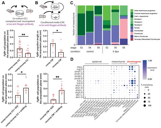 Fig. 4. Inhibitory factors, such as Noggin, are secreted from chondrogenic populations at regeneration-incompetent stages and block AER cell formation. (A) Top: schematic describing co-culture experiments. Middle: co-culturing regeneration-competent and -incompetent explants decreases the extent of Fgf8.L expression at the amputation plane at 3â dpa. Bottom: this effect can be rescued by adding anti-NOGGIN antibody. Regeneration-competent and -competent co-culture total, n=26 from four biological replicates; regeneration-competent and -incompetent co-culture total, 15 from four biological replicates; competent and incompetent co-culture, and anti-IGG antibody total, n=10 from three biological replicates; competent and incompetent co-culture, and anti-NOGGIN antibody total, n=10 from three biological replicates. *P<0.05 and **P<0.001. Data are mean±s.e.m. (B) Top: schematic describing conditioned media experiments to test the effect of secreted factors in regeneration-incompetent tadpole limbs. Middle: supplying conditioned media (CM) from regeneration-incompetent tadpoles to regeneration-competent explants decreases the extent of Fgf8.L expression at the amputation plane at 3â dpa. Bottom: this effect can be rescued by adding anti-NOGGIN antibody. Regeneration-competent CM to -competent explants total, n=8 from three biological replicates; regeneration-incompetent CM to -competent explants total, n=7 from three biological replicates; regeneration-incompetent CM to -competent explants, and anti-IGG antibody total, n=10 from three biological replicates; regeneration-incompetent CM and anti-NOGGIN antibody to regeneration-competent explants total, n=10 from three biological replicates. *P<0.05 and **P<0.001. Data are mean±s.e.m. (C) Abundance of mesenchymal populations across conditions reveals an enrichment of chondrogenic populations at regeneration-restricted and -incompetent stages, in both intact and amputated limbs. (D) Multiple BMP/WNT antagonists are expressed specifically in chondrogenic populations. This dotplot is generated using the pooled dataset, with late-stage tadpoles having high levels of chondrogenic and fibroblast populations, but not immature mesenchymal cell types, as shown in C. |