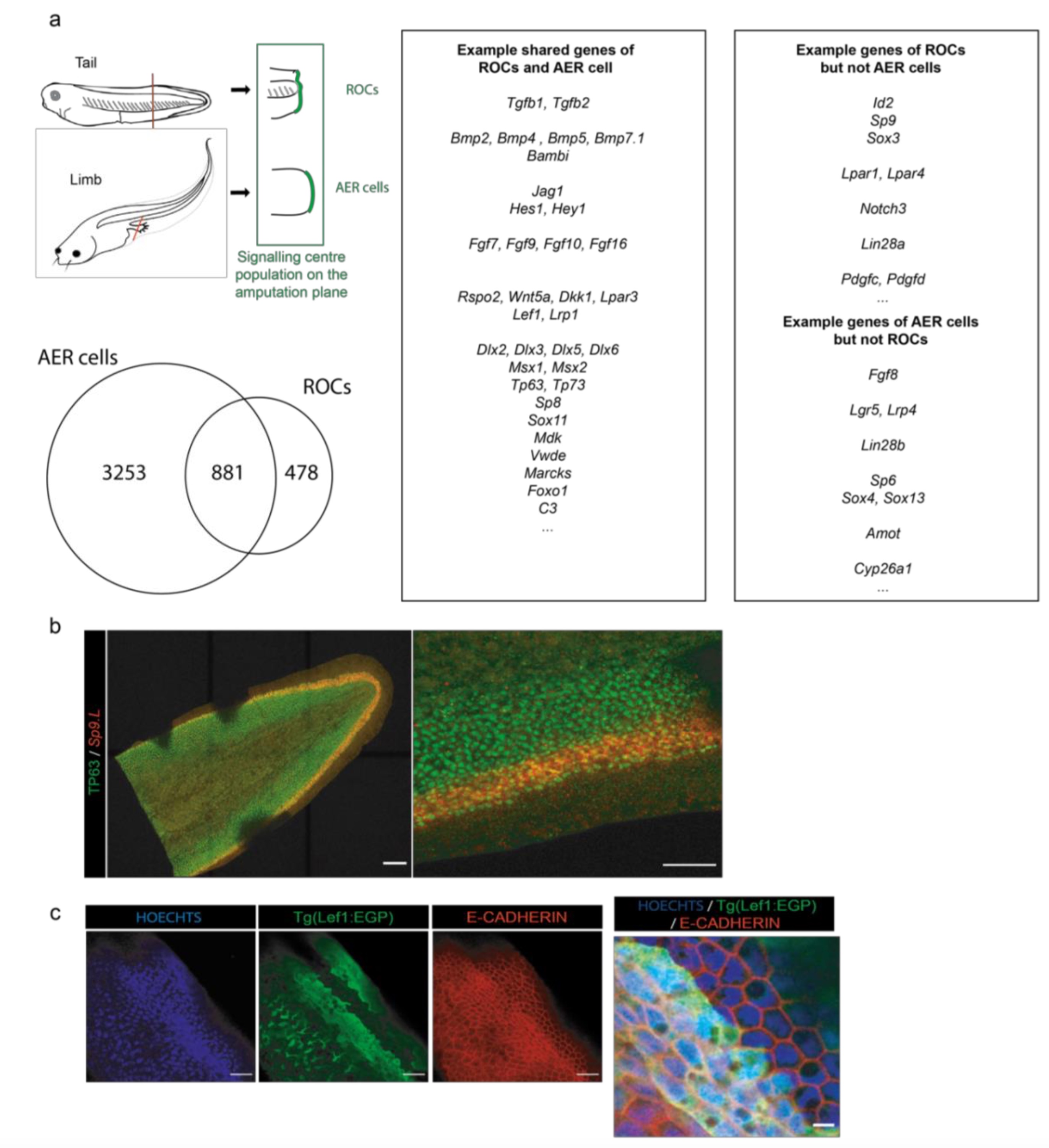 Figure S9: Specialised wound epidermis of tail and limb regeneration share some transcriptional similarities while presenting different cellular morphology. (a) (Left) A signaling center population serving as the specialized wound epidermis is associated with Xenopus tail and limb regeneration. However, tail uses regeneration- organizing-cells (ROCs) (Aztekin et al., 2019) while limb uses AER cells for this purpose. Both AER cells and ROCs share the expression of many genes highlighting their similarity, although there are some genes that are unique to each population. AER- and ROC-specific genes were identified as genes significantly upregulated relative to other basal epidermal cells. (Right) A select number of genes, specifically ligands and transcription factors that are associated with regeneration, are highlighted. (b) ROCs and AER cells show different morphologies (please see Figure S7 for AER cells). ROCs were visualized by staining NF Stage 40 by Sp9.L mRNA expression (highly specific for ROCs (Aztekin et al., 2019)) and TP63 immunolabelling for whole tail (Left) and zoomed in version (Right). In the zoomed in version for staining Sp9.L shows two level of expression in ROCs: a single outer layer of Sp9.L low cells, and multiple inner layers of Sp9.L high cells. Please note that this is not whole bottom-top image of a tail as evidenced by absence of TP63 staining in the in middle part of the tissue. Red, Sp9.L mRNA; Green, TP63. Scale bars= (left) 250 μm, (right) 100 μm. (c) ROCs are visualized using the pbin7LEF:GFP line, as defined previously (Aztekin et al., 2019), and E-CADHERIN staining was used to delineate cell shape. Inner layers of ROCs have flattened cell shape while the outside layer ROCs exhibit more square-like shape. ROCs do not have branched nuclei, unlike fin cells. Blue, Hoechst; Green, EGFP; Red, E-cadherin. Scale bars= 10 μm. |