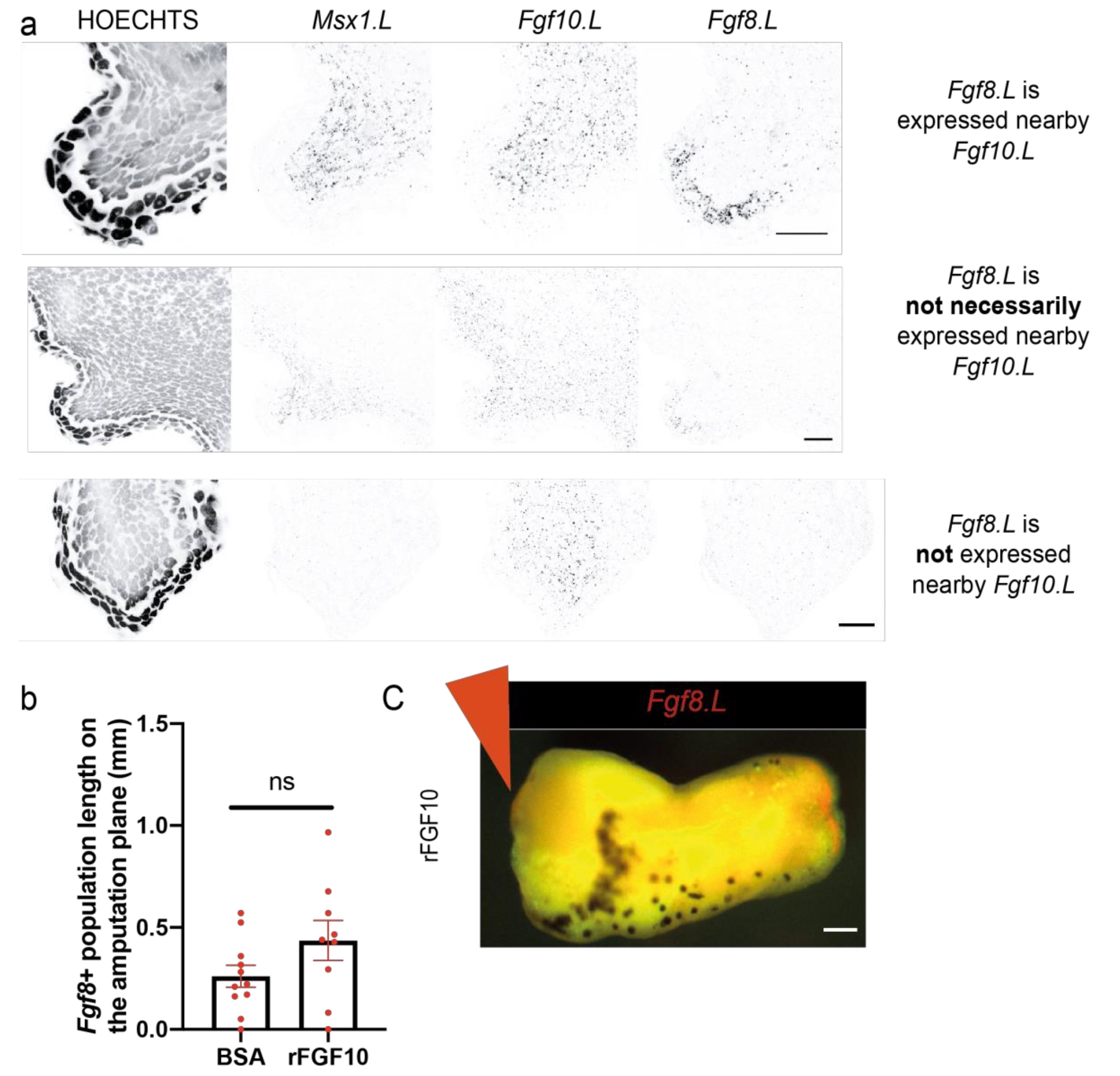 Figure S14: FGF10 is not sufficient to induce Fgf8 in all epidermis. (a) Examples of sectioned confocal images of 5 dpa in vivo samples from regeneration- competent tadpoles stained for Msx1.L, Fgf10.L and Fgf8.L. Top image series show high levels of Fgf10.L and Msx1.L in the mesenchyme associated with high levels of Fgf8.L in the surrounding epidermis. Middle image series show that not all epidermis in proximity of Fgf10.L + mesenchymal cells are expressing Fgf8.L. Msx1.L + mesenchymal cells are more correlated to Fgf8.L+ epidermis than Fgf10.L + mesenchymal cells. Bottom, although there is a high level of Fgf10 expression detected in mesenchyme, no Fgf8.L in epidermis or Msx1.L in mesenchyme can be seen. Scale, 20 μm. (b) Regeneration-competent explants were treated with rFGF10, and 0.1% BSA/PBS was used as control. BSA: total n=11 from 2 biological replicates; FGF10: total n=9 from 2 biological replicates; ns: P*>0.05. (c) Example whole-mount stereomicroscope image of rFGF10 treated explants showing a very mild expression of Fgf8.L at their proximal sites (n=4/7 from 2 biological replicates). Scale, 200 μm. |